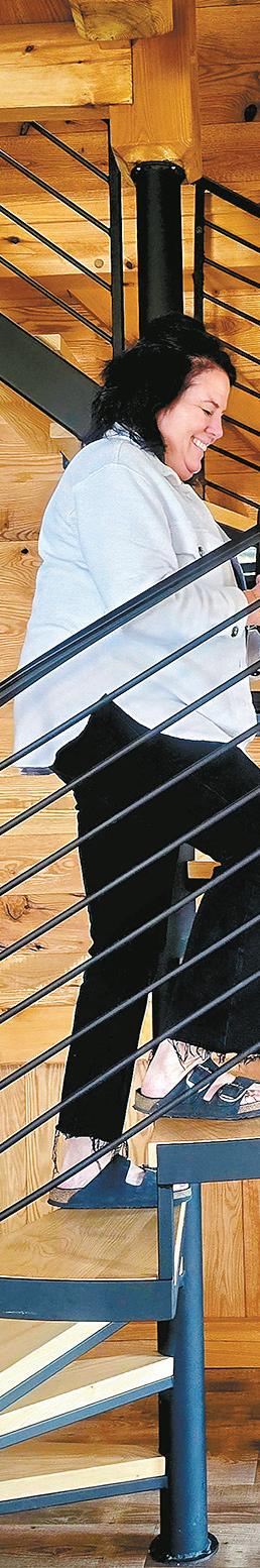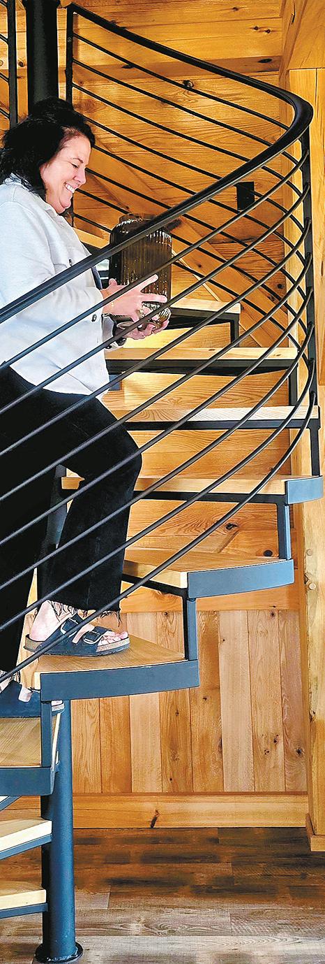 (Left) Lisa Herdering carries decorations up the spiral stairwell May 30 in MillCreek Barn near St. Rosa. The upper level area contains some books and toys to keep small children occupied according to their age levels.