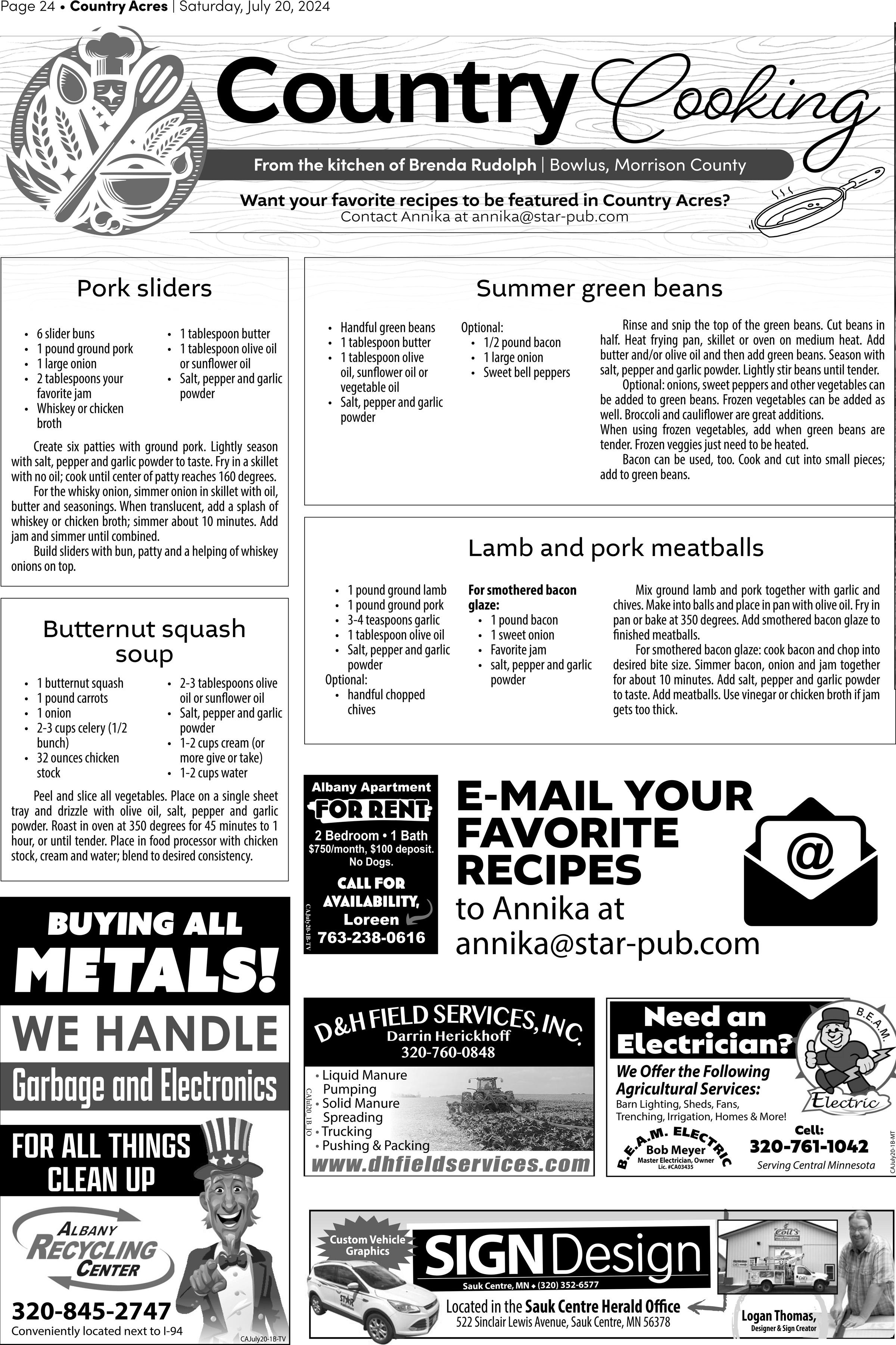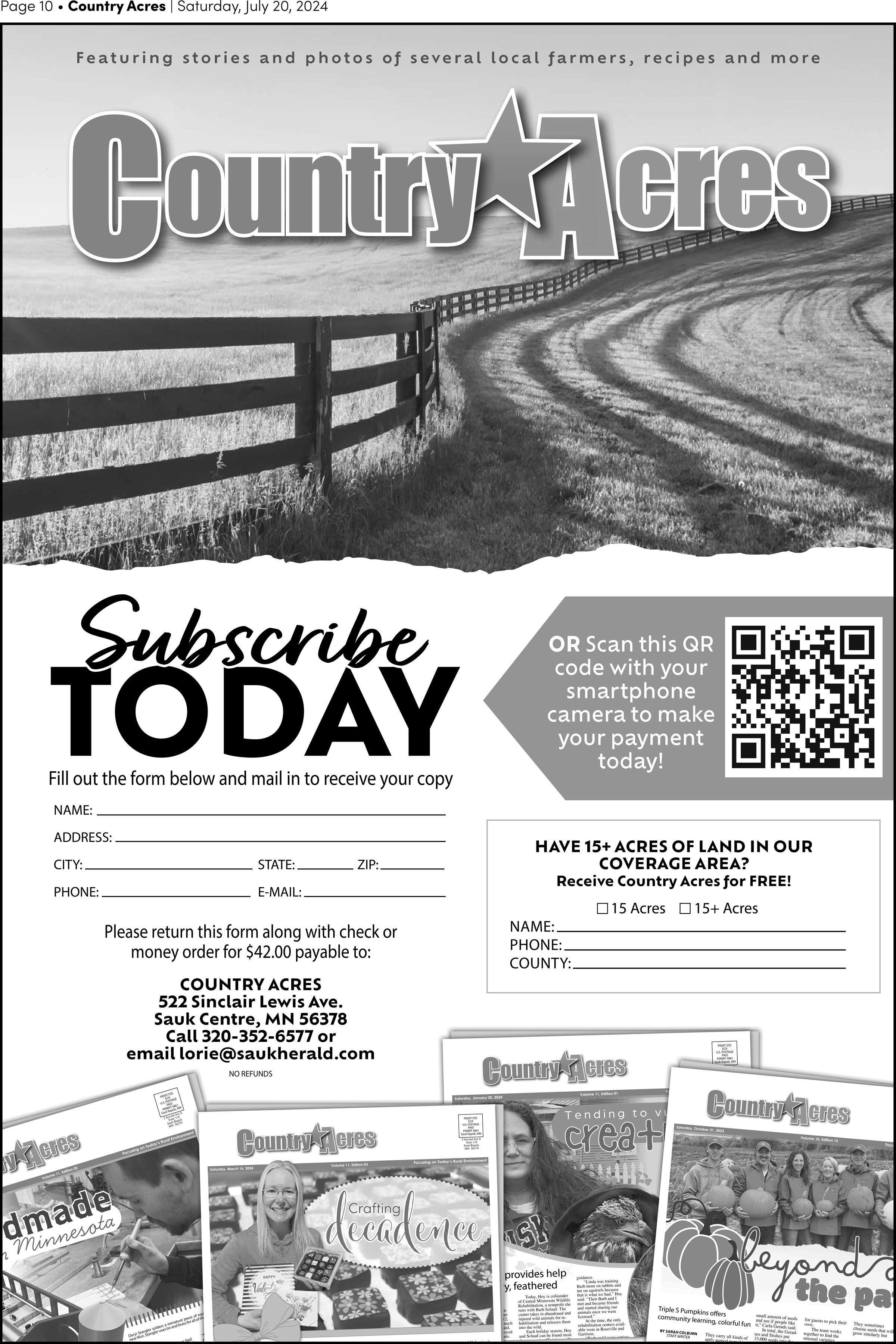 Country Acres will be published the first Saturdays of April, May, June, September, October and November, and the third Saturday of every month. Deadline for news and advertising is the Friday a week before publication.