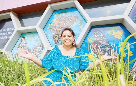 The Caroline Springs Gallery windows have been adorned with butterfly artworks as an homage to the migrant experience of the artist Audrey Buttigieg Cardona.