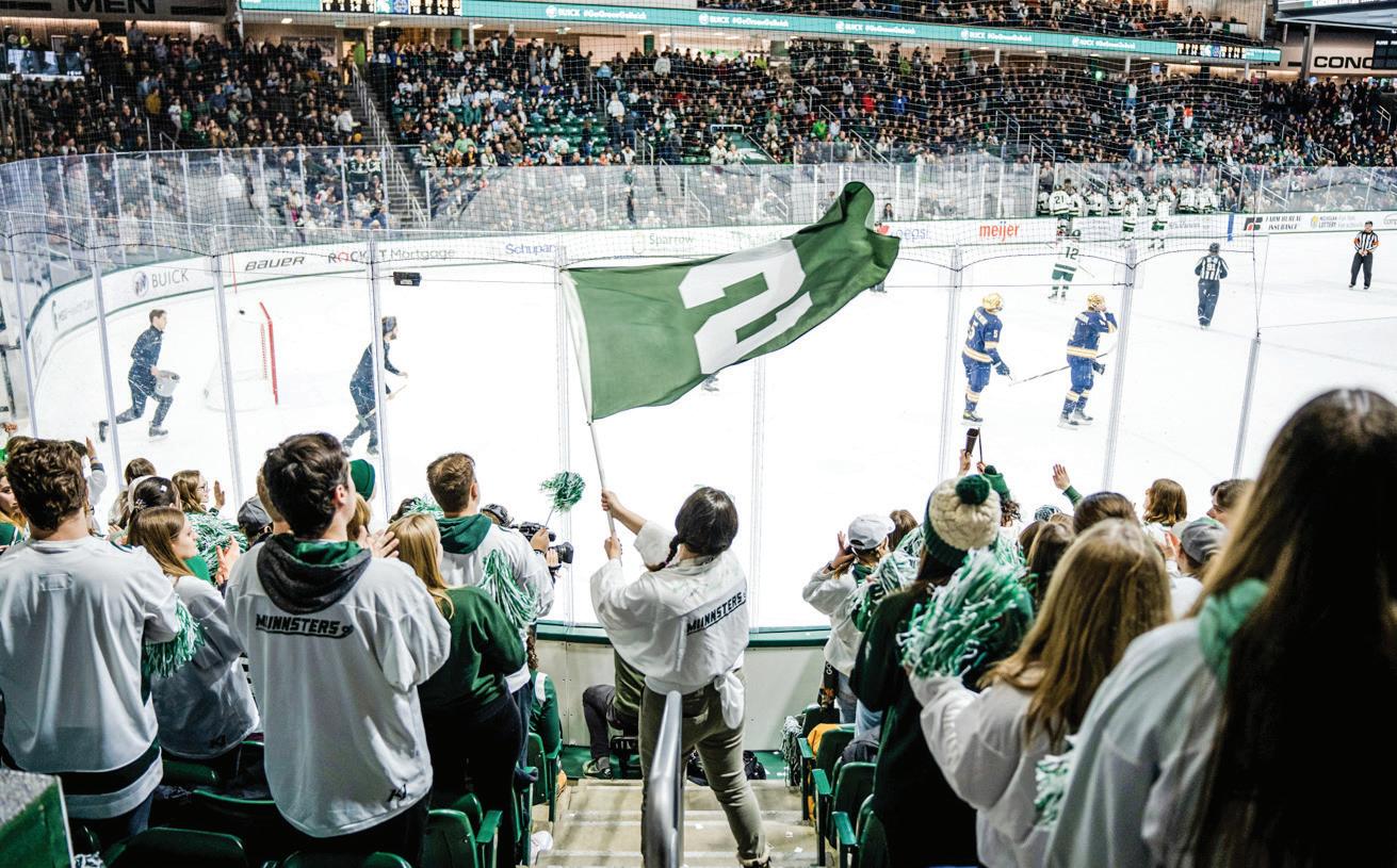 Michigan State hockey fan waves the Spartan flag after MSU scores their first goal of the night in a game against University of Notre Dame on Feb. 4, 2023. The Spartans defeated the Leprechauns with a score of 3-2 to sweep the weekend series.