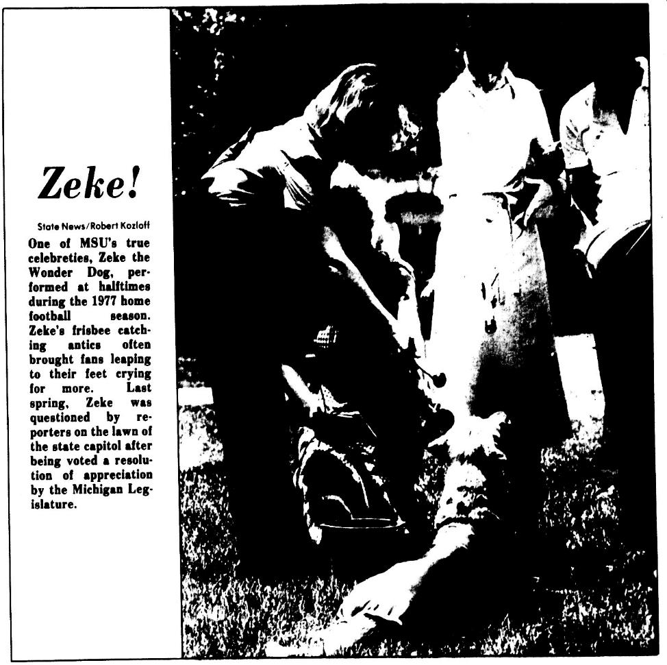 And, according to a 1978 edition of the State News, Zeke was questioned on the capitol lawn after receiving a resolution of appreciation by the state legislature.