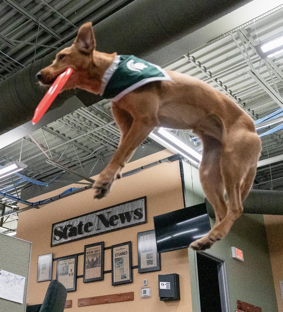 The Foleys introduced Buckshot a.k.a. Zeke IV at a basketball game in the days following his predecessor’s death. For nearly 10 years, he entertained Spartan fans with his frisbeecatching and trick-turning, and he even stopped by the State News office to admire some of our photos… of himself.