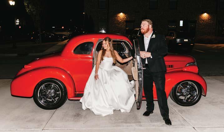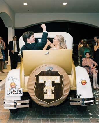 Another key theme of our big day was a nod to our “House Divided” relationship. While I graduated from the University of Georgia and bleed red and black, Jack graduated from Georgia Tech and is a Yellow Jacket through and through. Over the years, we’ve spent a lot of time watching both the Jackets and Dawgs play, learning to divide our time between the two as much as each of us will allow. Our goal was to ensure that moments from our reception made both UGA and Tech fans smile. From calling the dawgs and my “guitar solo” on a bright red UGA-themed electric guitar, to our exit in none other than the Ramblin’ Wreck, a 1930 Ford Model A Sport Coupe that has led the Yellow Jackets onto the field for every home game since 1961, we honored both of our alma maters and brought a little of both Athens and Atlanta to Statesboro.”