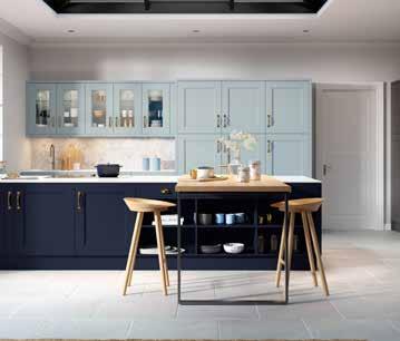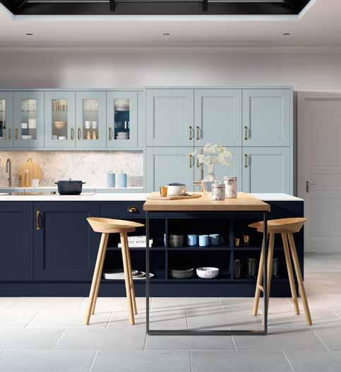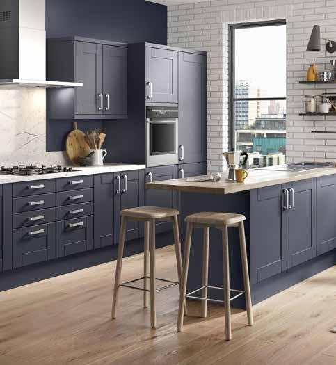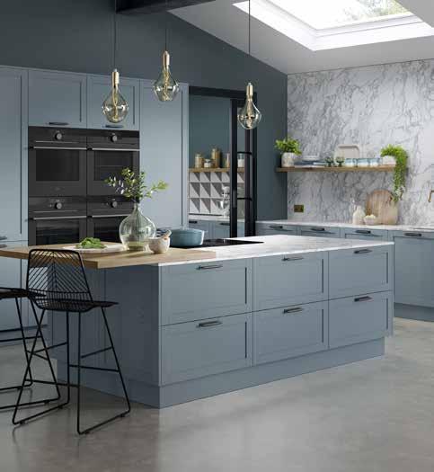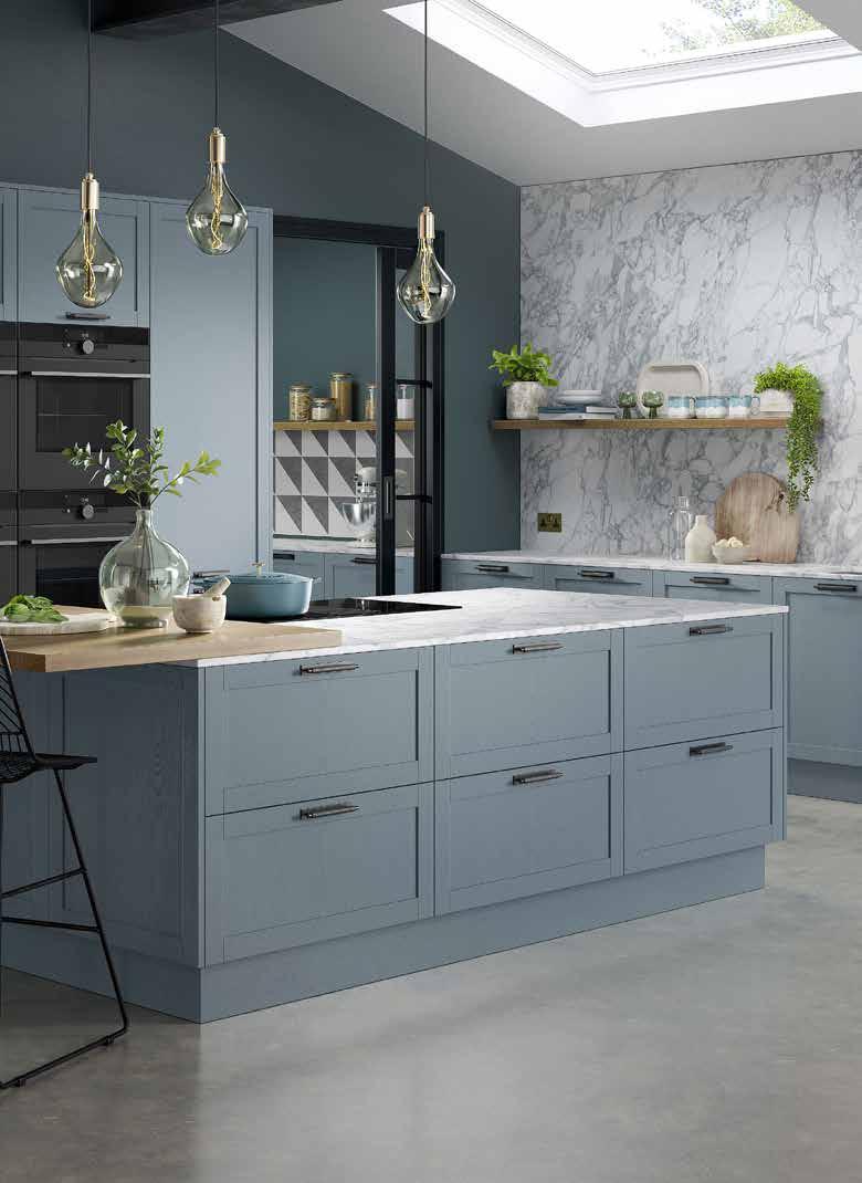 A clean, elegant style with a contemporary twist on a traditional Shaker door. With its sleek narrow frame and subtle woodgrain finish, this kitchen, painted in Spitfire Blue, is bound to get noticed.