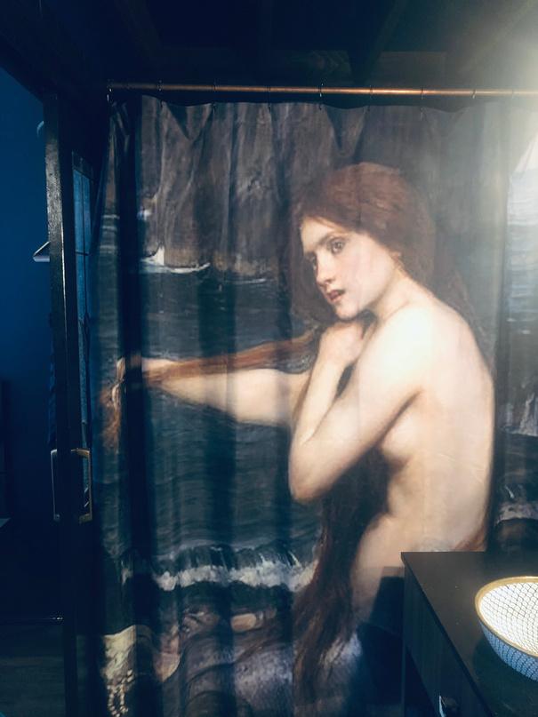 When it came to the bathroom there was a challenge. I have never liked shower screens as I find they never look that pretty.There was not enough space to utilize another tiled wall but then there was a brilliant discovery. Whilst indulging my new interest in mermaids I came upon a stunning painting by John William Waterhouse (British, 1849-1917).The Salon colours were already settled on and my tiles were chosen and this mythological Mermaid painting just worked so beautifully so I sourced her in the form of a shower curtain. She is so hauntingly beautiful and I am so happy to give her a home in the Salon de la Sirène.