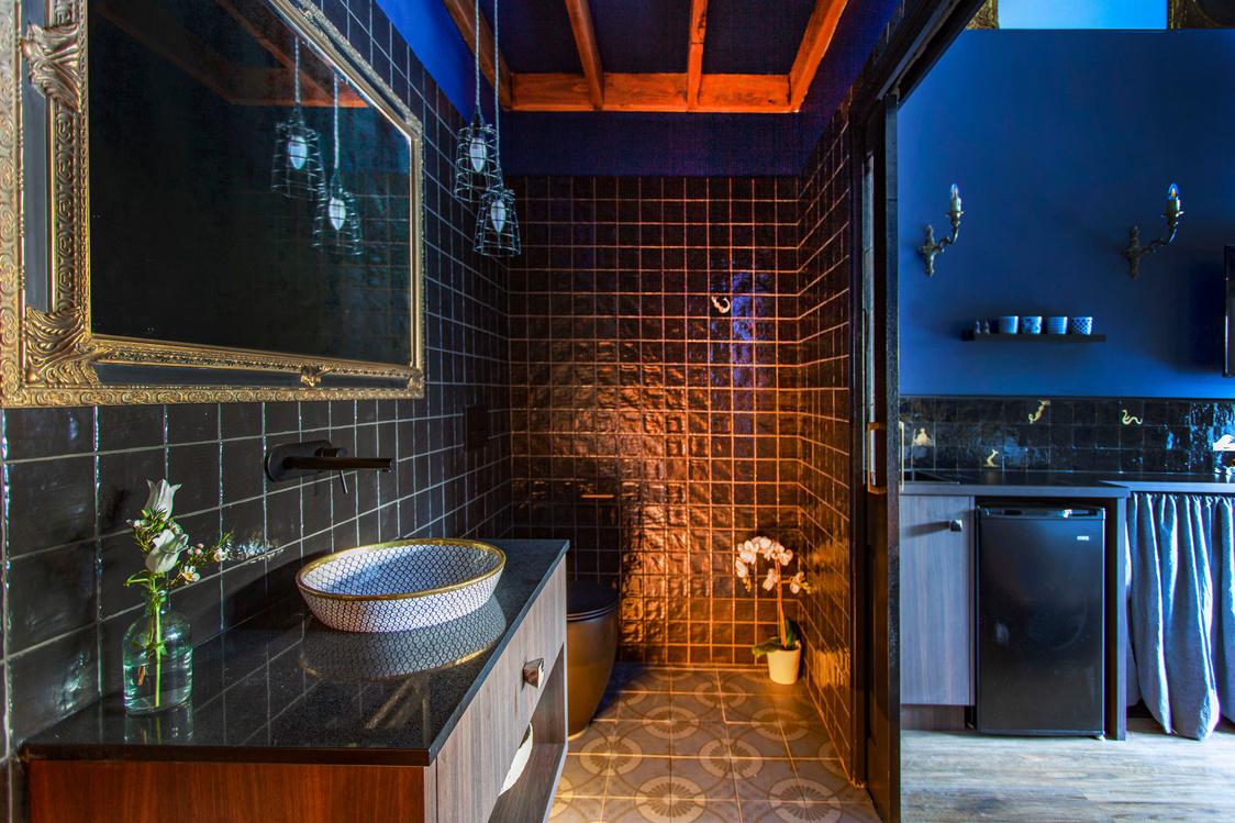 Count them.There are 1200 100mmx100mm tiles hand laid on these bathroom walls. They are Spanish tiles and in some lights they look like chocolate velvet. They are a crazy splurge.