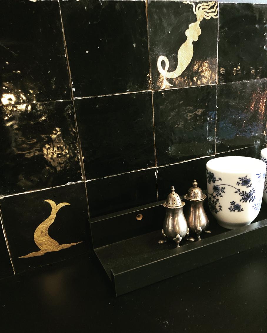 Possibly the heros of the room are the sublimely beautiful gold motif tiles Hand painted in Paris I pitched the idea to our artist friend and indicated our Salon was going to be a perfect home for these gorgeous creations. The little box arrived soon after and we proudly offer them a home by the sea. There are two mermaids in this collection One resides in the bathroom and the other in the main room Le Sirène means Mermaid and so the Salon de la Sirène was christened