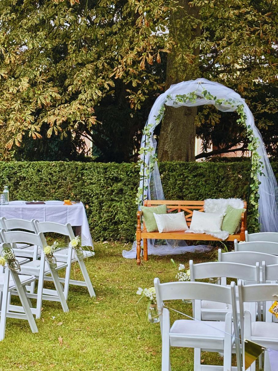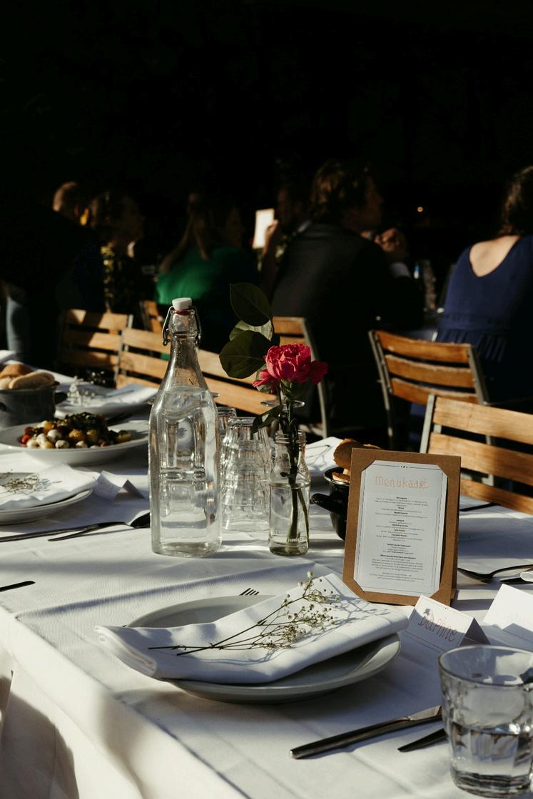 Het ruime terras is perfect voor een borrel, receptie of diner. Met statafels, parasols en een vuurkorf ontstaat een sfeervolle setting. Wij zetten alles klaar, maar de aankleding mogen jullie zelf verzorgen om hier je eigen persoonlijke tintje aan te geven! Trouwen kan binnen of buiten; op het terras of bij onze geheime plek tussen het groen – eventueel met witte stoeltjes voor een romantische ceremonie. Het is ook mogelijk om een tent te huren voor over het terras heen zodat je, ongeacht wat het weer doet, buiten kan blijven.