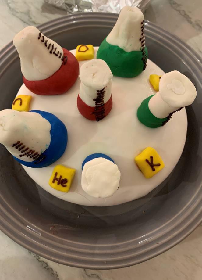 For STEM week, the College hosted a virtual cake competition. Students were tasked with creating scientifically themed cakes – the more real the better! All the entries displayed incredible creativity and scientific knowledge. First prize went to Myriam (top left), whose cake was a cross-section of the skin and even had blood vessels in the form of jelly sweets. Second prize went jointly to Florence (top right), whose cake represented a strand of DNA, and Misty (right), whose cake was Chemistry-based and represented elements of the periodic table.