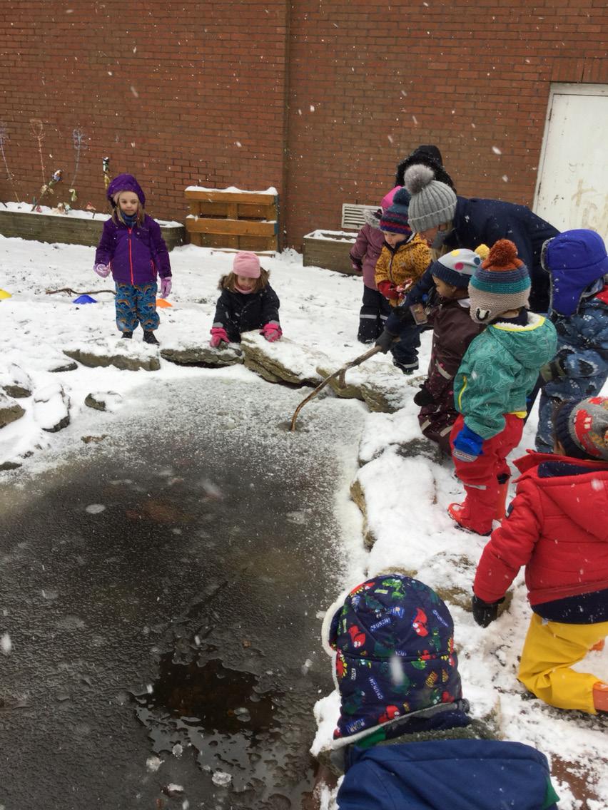 InJanuary, Nursery pupils traded in playing with mud for playing with snow. They had fun making snowballs, drawing pictures in the snow, and enjoyed painting the snow different colours. They were particularly fascinated by the physical changes in the pond as it froze over. They experimented with throwing snow onto the top of the pond and watching how the snow changed.