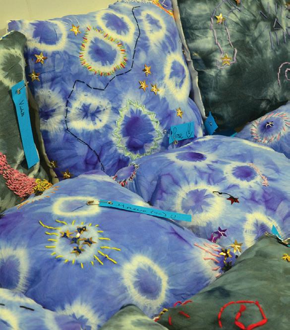 Students started with some tie-dyeing before creating designs to stitch onto their fabric pieces. They looked at work by contemporary textile artist, Karen Rose and photographic images of real galaxies and nebulae, to help inspire them. After several weeks of sewing, the cushions were then created. They were all so proud of the end results.