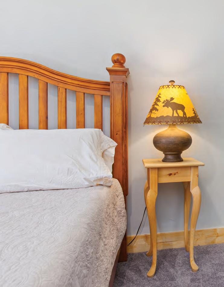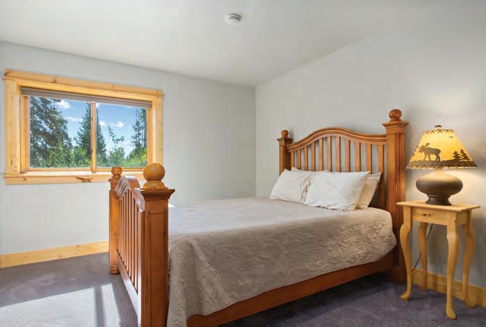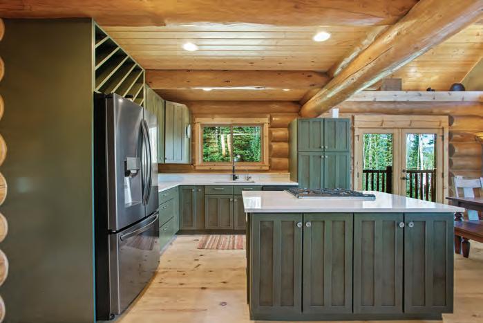 The cabin has recently been fully remodeled, boasting over $300K in upgrades and improvements including a new Corten rusty metal roof, new mechanical systems, a boiler system, kitchen appliances, kitchen and bathroom counters, sinks, plumbing fixtures, new paint throughout, new carpet, and new pine wood floors. As you step inside you’re greeted by the majestic floorto-ceiling stone fireplace, serving as a stunning centerpiece within the cabin. The living/dining area has soaring vaulted ceilings supported by massive log posts & beams. The open floorplan invites you to unwind and immerse yourself in the cozy ambiance, while the generous windows frame picturesque views of evergreens, aspens, Hahns peak, and Steamboat Lake. Luminate’s high-speed fiber optic internet (1 Gbps) offers a seamless work experience in a tranquil remote location, ensuring uninterrupted efficiency.