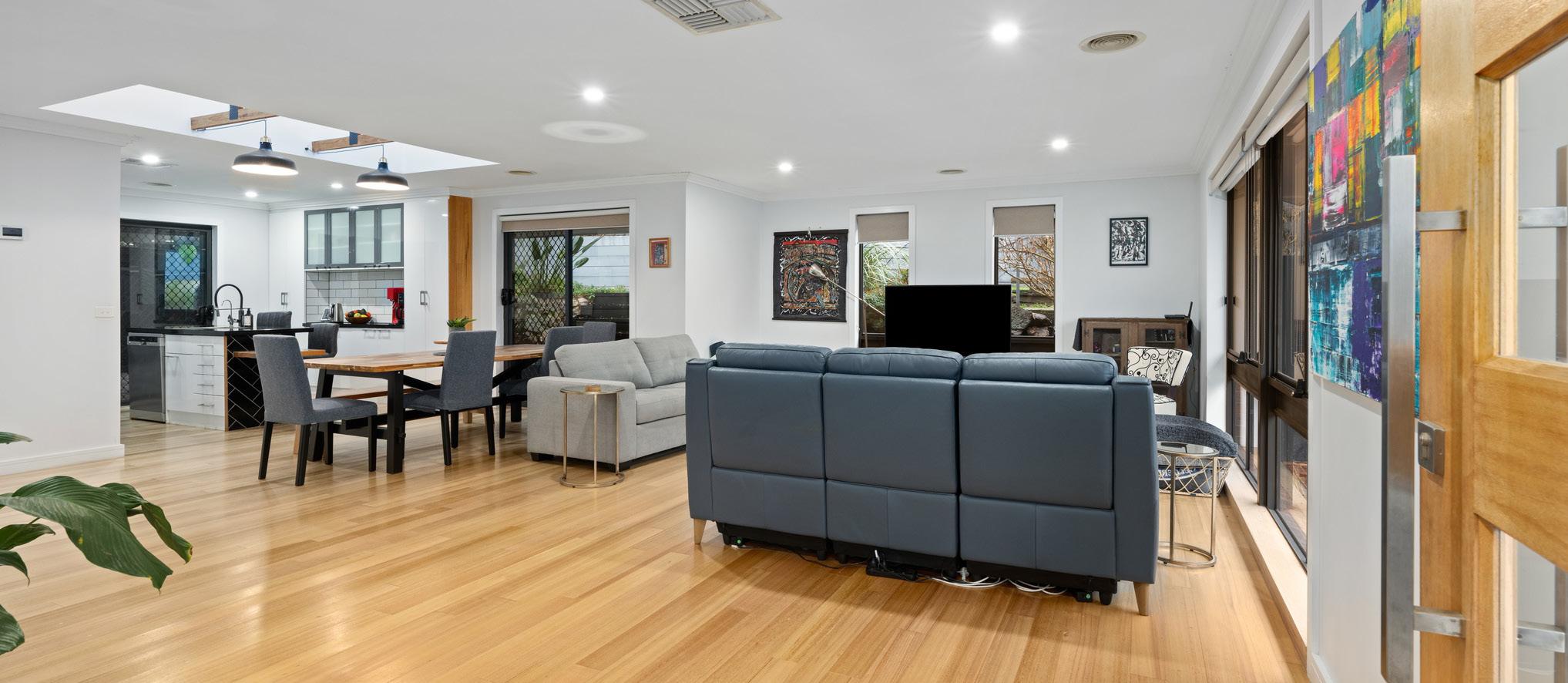 Highlighted by gleaming polished hardwood floors, the home features an open-plan lounge and dining area seamlessly connected to a renovated kitchen. The kitchen boasts ample storage, stone benchtops, stainless steel appliances, and a functional island bench. Sliding glass doors lead to a private rear paved alfresco area complete with a brick pizza oven, perfect for outdoor dining.