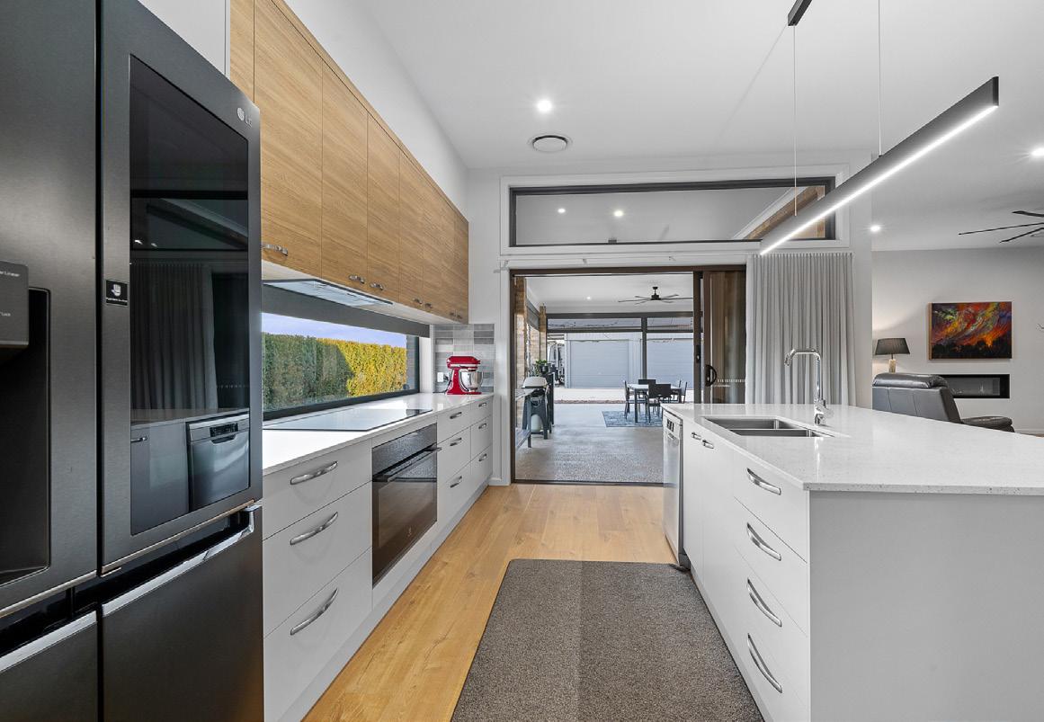 At the front of the home, a generous formal lounge creates separation from the rest of the household, ideal for quiet evenings or entertaining guests. Flowing through, the home opens into a vast open-plan kitchen, living, and dining area, warmed year-round by a gas heater. The kitchen is the true heart of the home, offering space, storage, and functionality for everyday living.