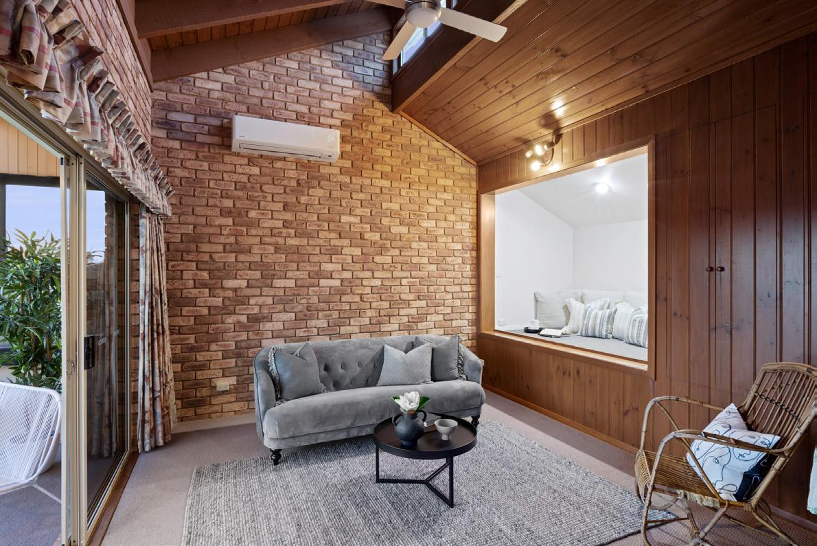Accommodation includes four spacious light filled bedrooms, rooms two and three with built in robes. The fourth bedroom could also convert to a convenient home office. The oversized master bedroom is located upstairs and features raked ceilings, providing a sense of grandeur. Strategically segregated from the other bedrooms, this room basks in sunlight from overhead skylights, and enjoys a serene outlook from a private balcony. The generous floorspace provides a tranquil retreat from the remainder of the home. The renovated ensuite with shower and bath adds to the luxury of the space.