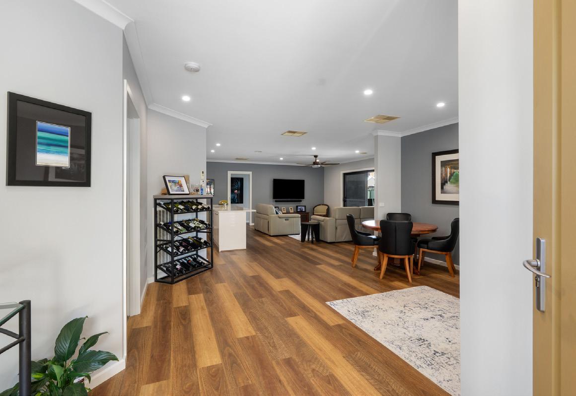 From the moment you step inside, premium finishes, generous proportions, and an intuitive layout set the tone for a residence of impressive quality. The spacious open plan living, dining, and kitchen zone forms the true heart of the home. The beautifully appointed kitchen boasts stone benchtops, stainless steel appliances, and abundant storage, while the adjoining living and dining areas are enhanced by glass sliding doors that extend out to an undercover alfresco, ideal for year-round entertaining.