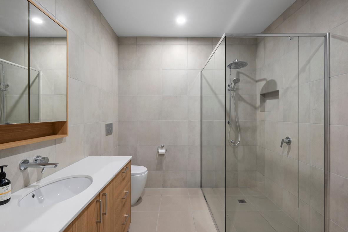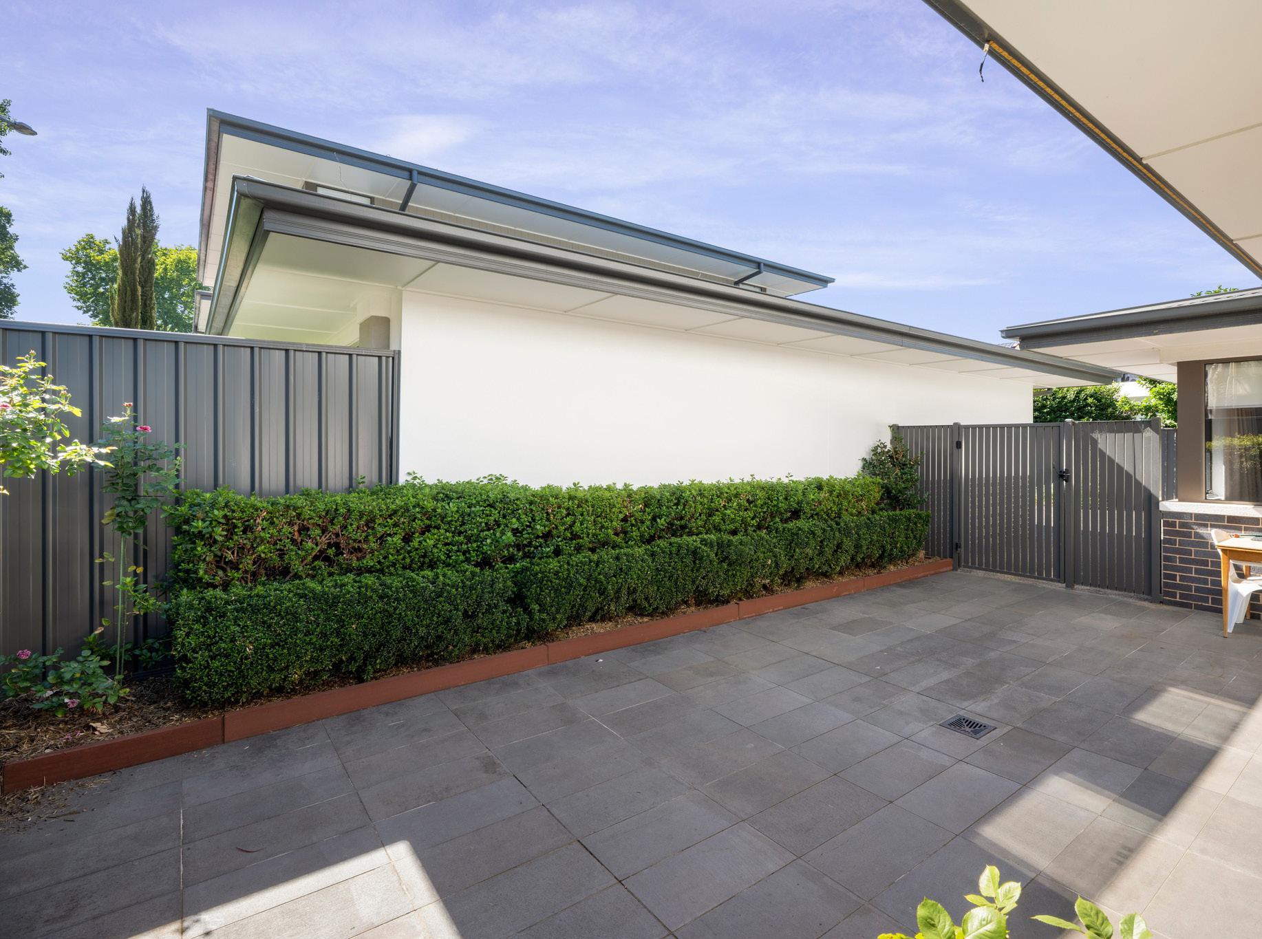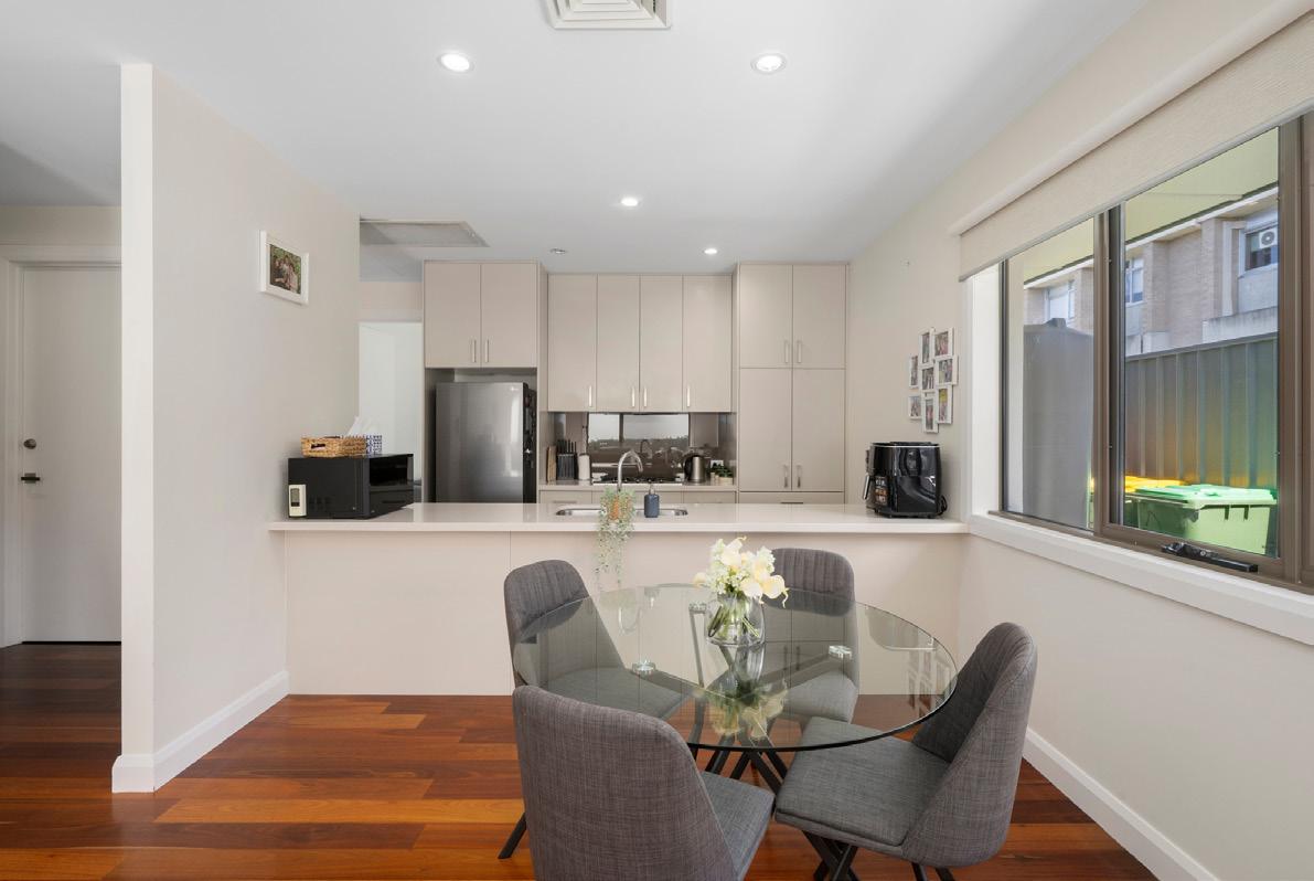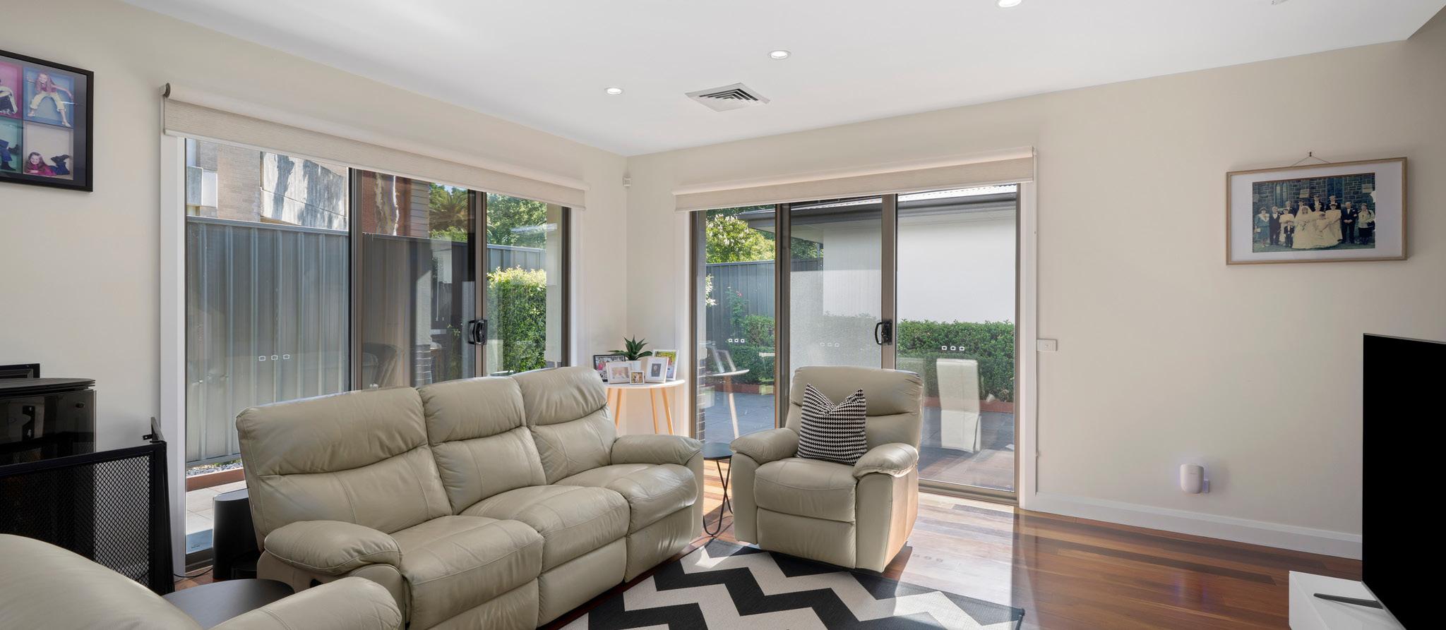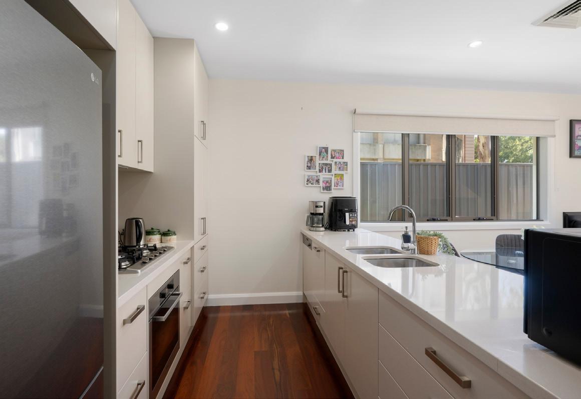 Polished hardwood floors lead you through the lower level, where the home’s thoughtful layout enhances everyday comfort. The galley-style kitchen features stone benchtops, stainless steel appliances, and high gloss cabinetry, flowing seamlessly into the dining and living area. With its northern orientation, this space captures beautiful winter sunlight, creating a warm and welcoming atmosphere year round. Sliding doors open to a generous courtyard framed by mature plantings—an ideal retreat for morning coffee, quiet reading, or relaxed entertaining.