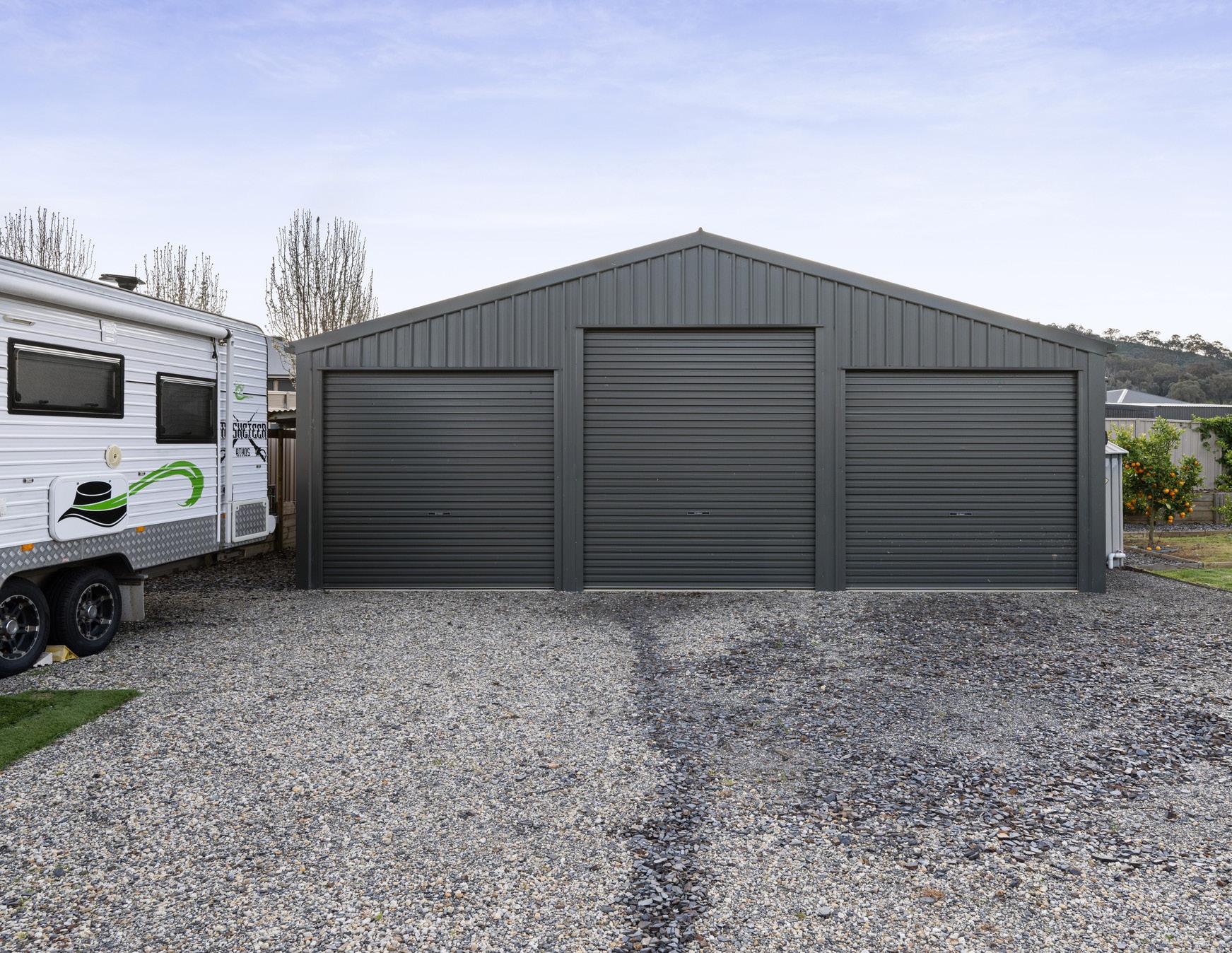 The spacious frontage allows for double gate access to the backyard on both sides of the home. At the rear, you’ll find a pool ideal for the family and a large three-bay shed, perfect for tradespeople or storing extra vehicles like boats, caravans, and trailers. Built by Southernvale Homes, the property also features modern conveniences such as 9-foot ceilings, ducted heating and cooling, and a timeless color palette.
