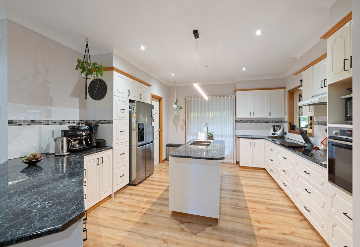 The heart of the home is the refurbished kitchen, filled with natural light and thoughtfully updated for modern living. It features a central breakfast bar, pantry, Bosch electric oven and double fridge space, creating an inviting hub that connects seamlessly to the expansive dining and living areas. These open spaces are ideal for everyday family life, while the huge separate lounge with a gas log heater offers a warm retreat for quieter moments. A generous rumpus room adds even more flexibility, providing the perfect zone for children, hobbies or relaxed entertaining.