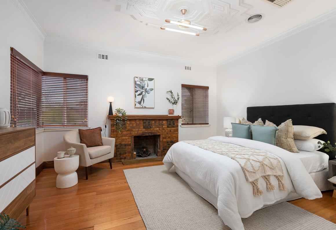 Accommodation is made up of four good sized bedrooms, two with built in robes. The master bedroom features a wood fireplace and retro corner windows to maximize the natural lighting. Serviced by the central bathroom which features unique pastel colours and classic squared tiles, all representing the heritage of the home.