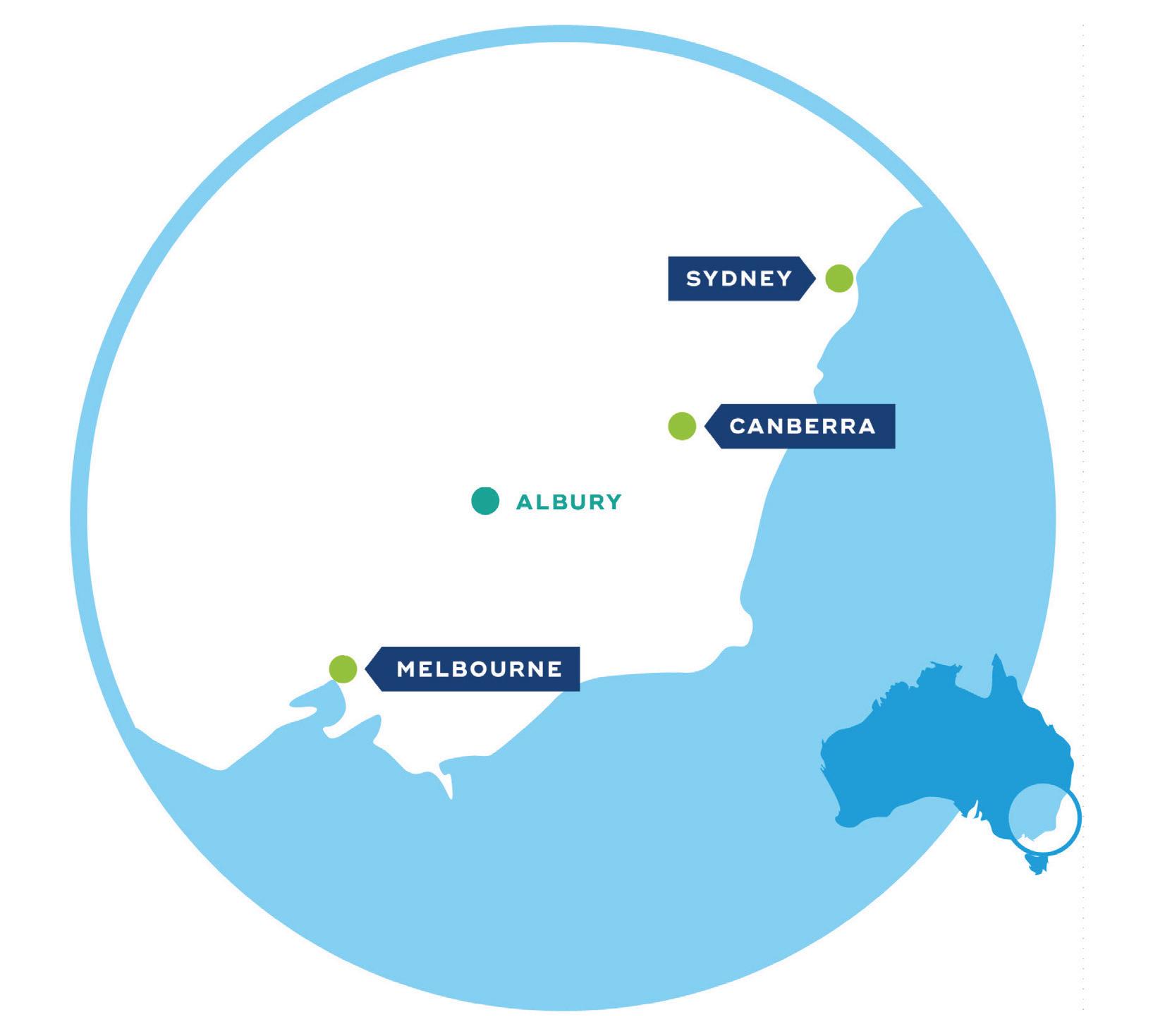 1km Hume Highway 40kms Albury Airport 40kms Albury CBD 35kms Wodonga CBD 590kms Sydney 290kms Melbourne