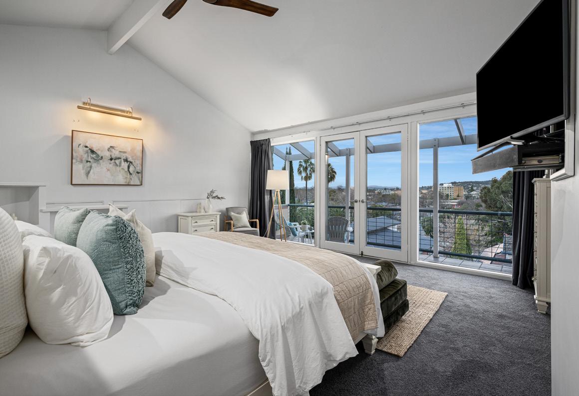 Going up stairs, an aura of calm continues into the main bedroom revealing a second balcony, large walkin robes and boasting a soft pastel colour palette inspired ensuite, highlighted by a pitched ceiling and complemented by brass fittings throughout.
