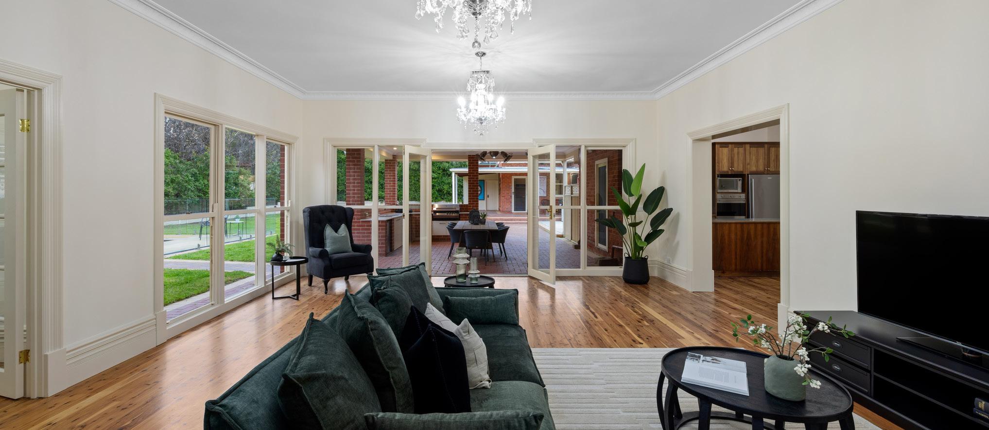 The main residence delivers timeless character through a solid red brick construction, bold high ceilings and ornate Victorian finishes. Comprising a generous floor plan encompassing five full bedrooms, two living spaces and an additional study, the single level design offers flexibility to families of all stages.