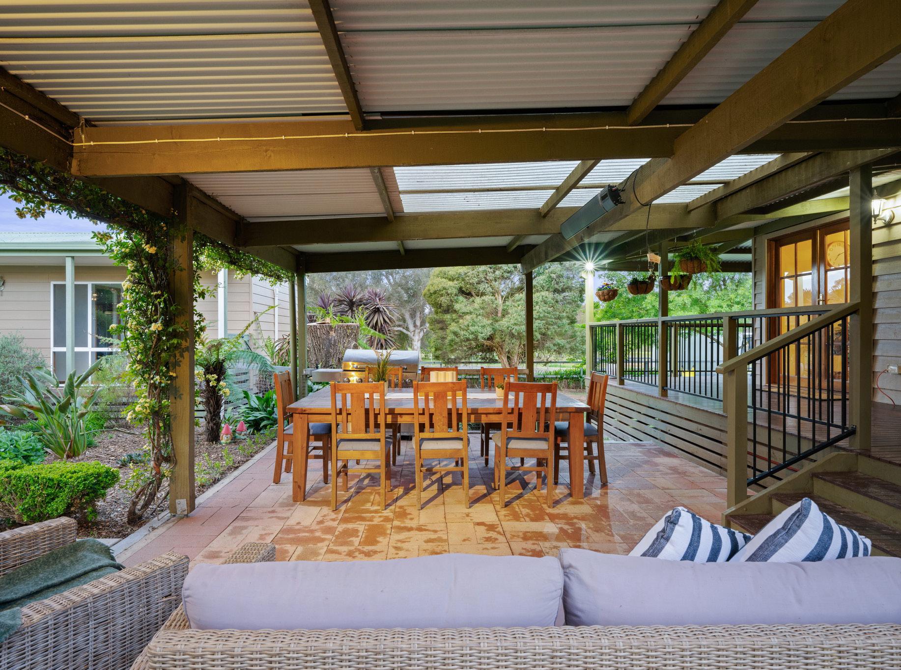 Outside, the established gardens create shady retreats in summer and sunny spots in winter, ensuring the home can be appreciated throughout the seasons. All the hard work has been done with fully irrigated gardens, including vegetable garden beds, a diverse assortment of fruit trees, and a chicken coop to complete the idyllic country lifestyle. Equine enthusiasts will be thrilled with the full-sized dressage arena featuring a sand and rubber mix surface. The property also offers convertible stables with up to four bays, a separate wash bay, and tie-up areas that are sure to impress. Four paddocks, three of which have shelters, provide ample space for hobby farming, and all paddocks are hotwired for livestock security.