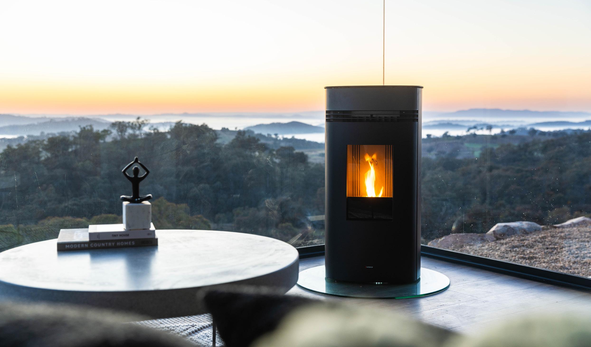 Pellet heaters have the same ambience as a wood fire, yet the control of gas or electricity. Their high efficiency means that they only have to be topped up with pellets every couple of days and they produce far fewer emissions compared to traditional wood heaters.