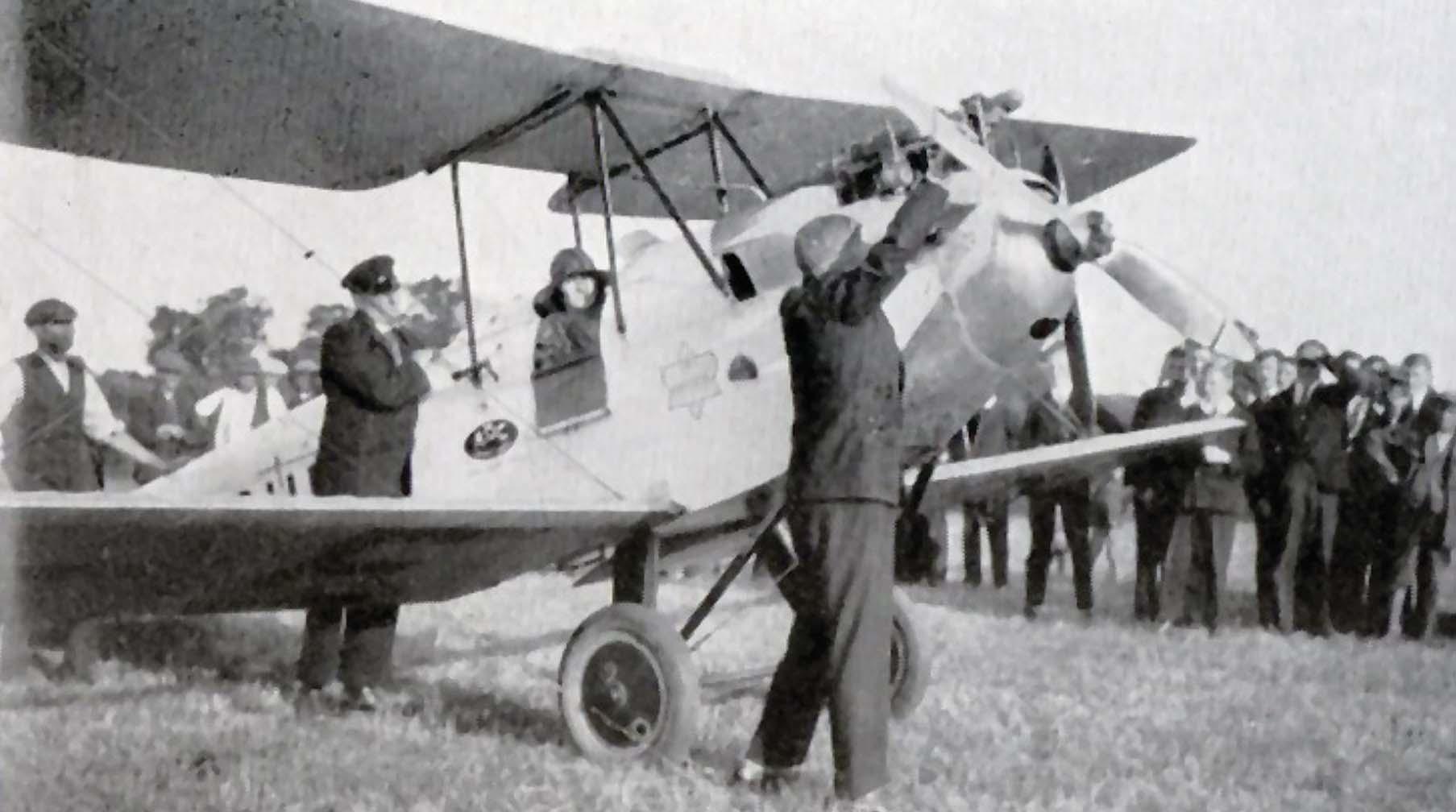 The latter two feats were accomplished in a De Havilland DH60X ‘Cirrus’ Moth (so named because of the Cirrus engine with which it was fitted). That plane - registration mark G-EBUF - is the one in which he flew to the College. It was supplied to Stack by ADC Aircraft Limited, which manufactured the Cirrus engine, and for whom Stack was now chief test pilot. The company’s ‘ADC’ logo is visible inside a dark oval on the fuselage.