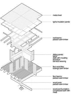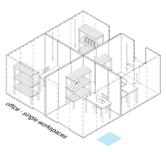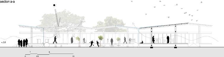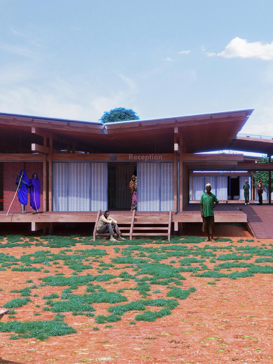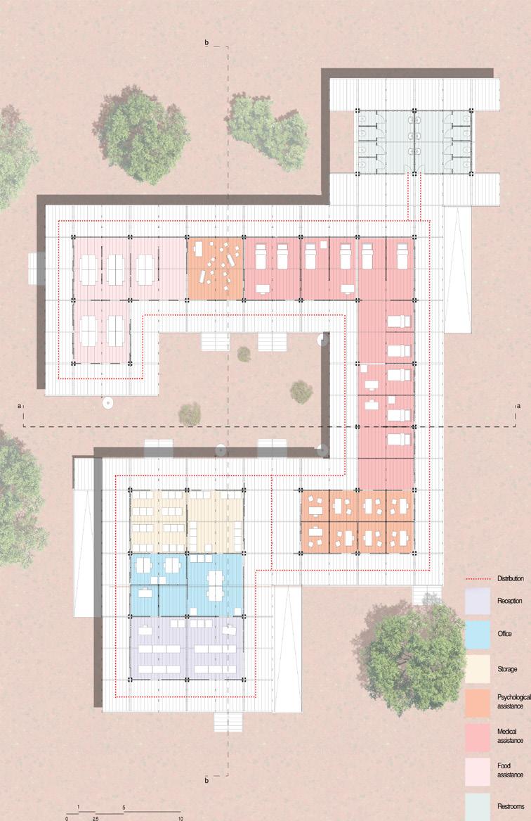 The facility is generated by modular repetition. Each module and the assembly are both represented by a pivotal centre, 4 posts and the courtyard. Sliding panels in-between the structure posts can either separate one space from the other, according to different functions, or be removed to link them. The concept of the centre recalls the spiritual value that some African vernacular villages conveyed. This is reproduced by gathering the modules around a central court where planted trees claim rebirth from crisis.