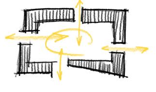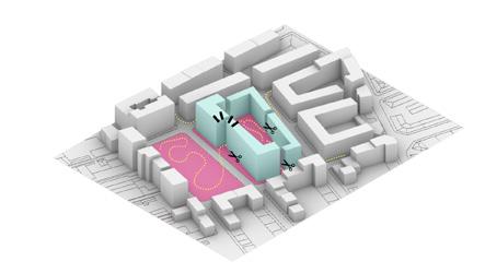 Existing building blocks are transformed and new shape is given, based on walking paths and side views. The aim is to enhance porosity through the buildings among the nearby streets and plaza, thus creating connections.
