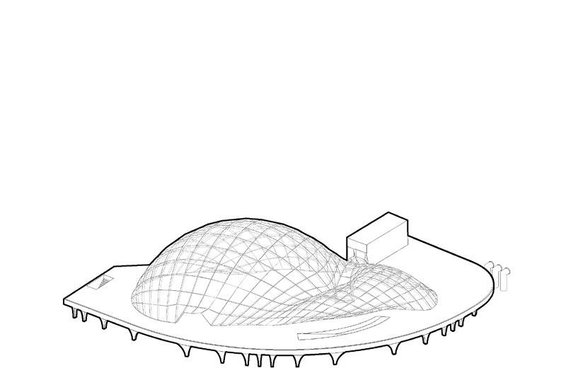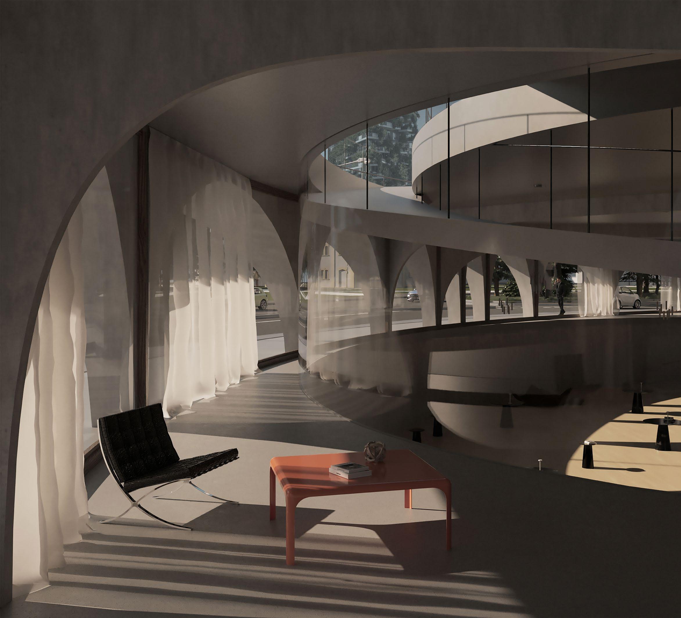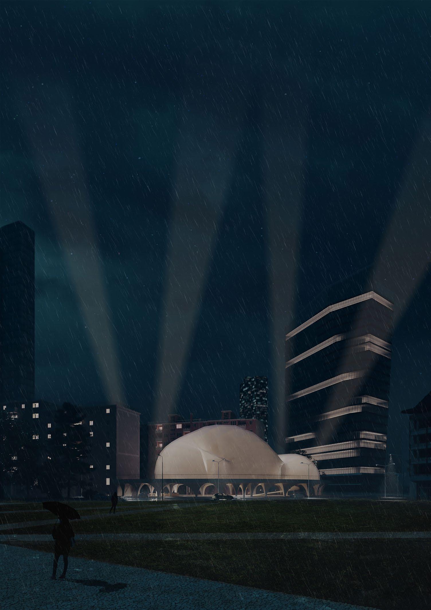 To compete against ready made set designs that can easily be placed inside a box, a pneumatic structure has been studied to achieve such level of demands for a fashion world that is constantly moving and changing. There are no fixed characteristics, everything is changing in a constant “Divenire” being ready for any necessities. All this while being on a concrete pedestal over Porta Nuova park ( the BAM) which can, at the same time, used for many opportunities welcoming the visitors as an open architecture.