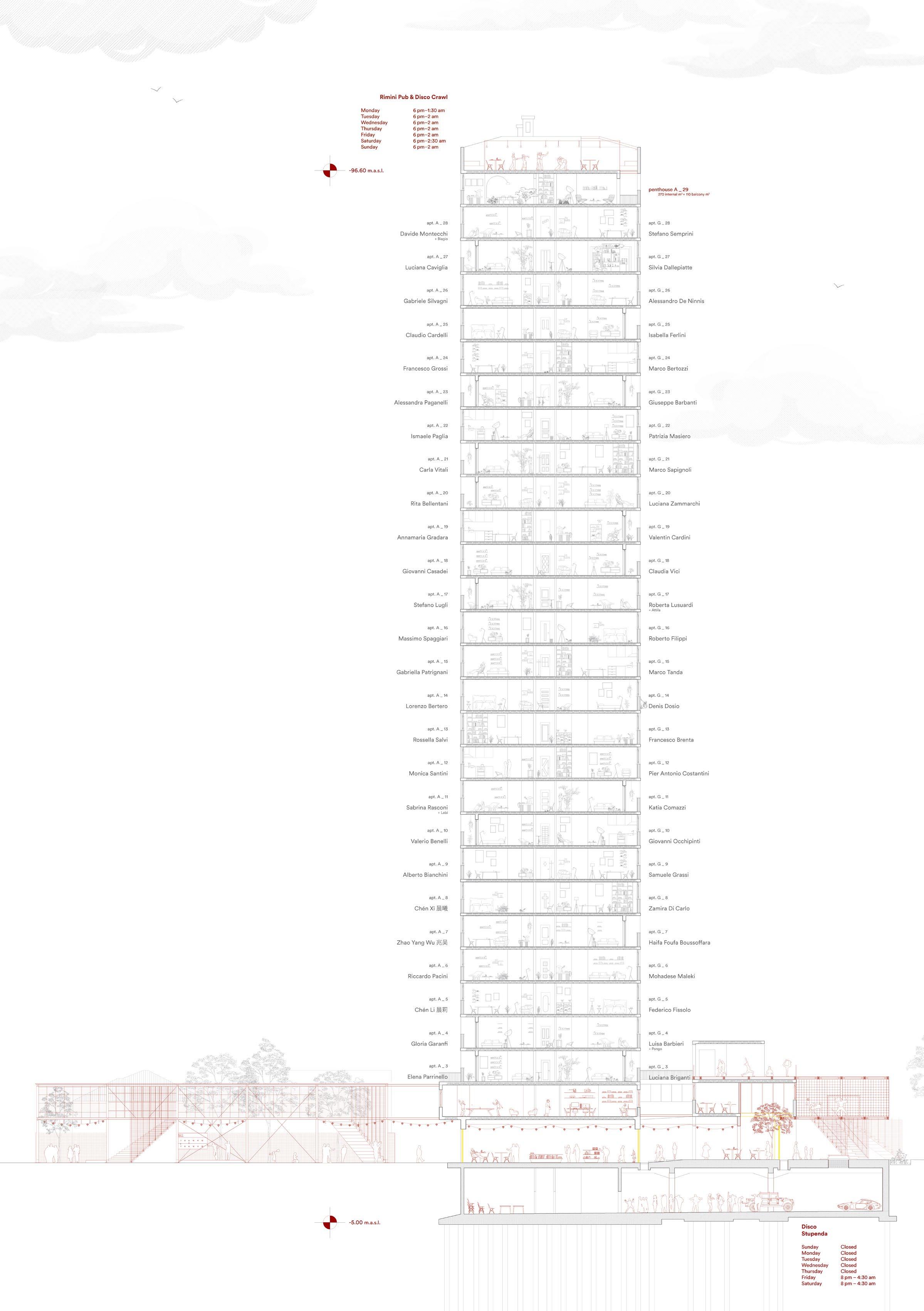 Attract people is just a way to make it appreciated more and not be an “INVISIBLE” building. new common spaces for the residents and public ones to bring inside some of the playful life of the city. A disco at the underground floor is just an idea following the standards the Riviera as to attract more and new people every year and more important to gain money from all of this. Money that could be invested in ammodernisation works on the skyscraper itself that need to stay up to the new constructions standards.