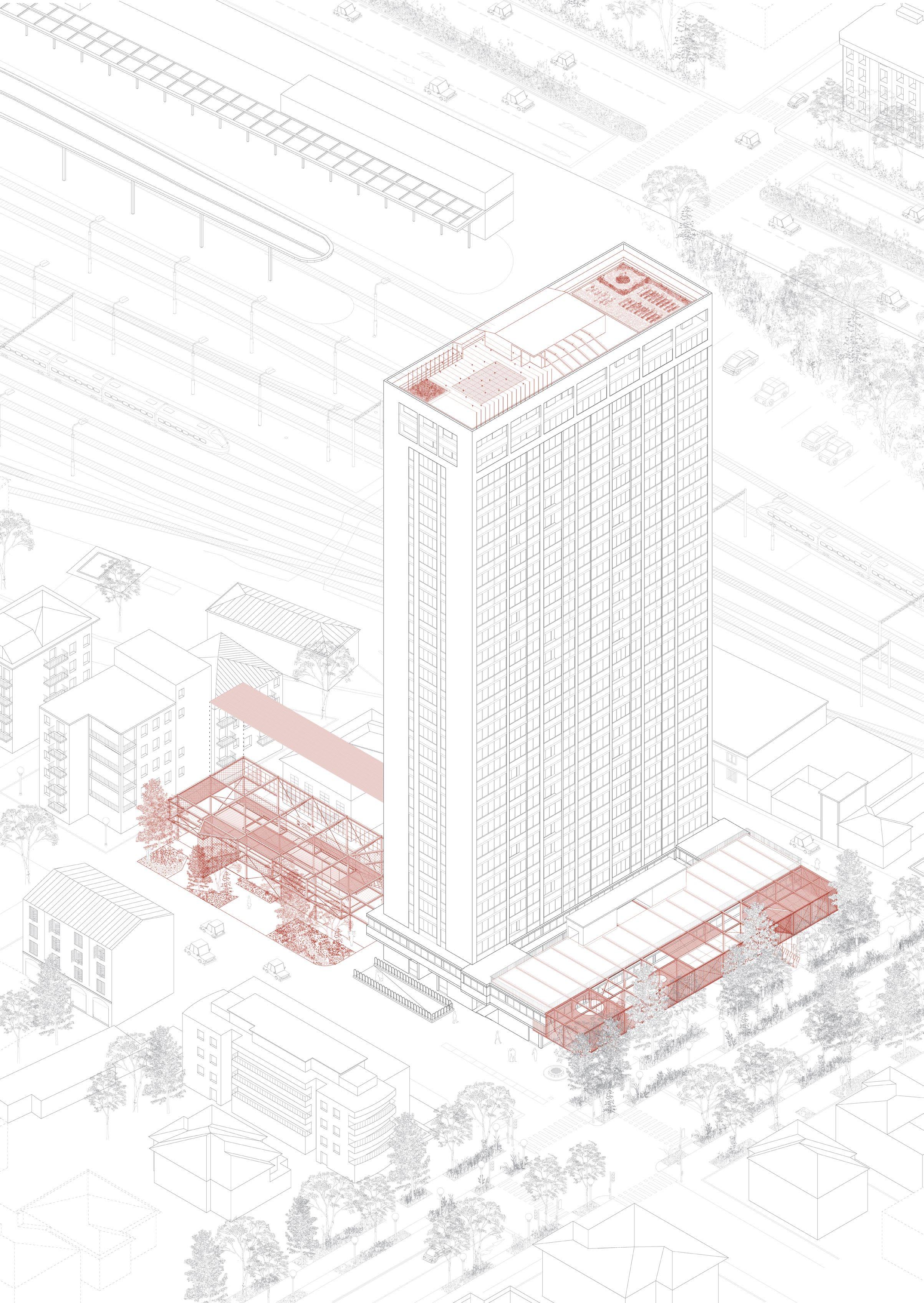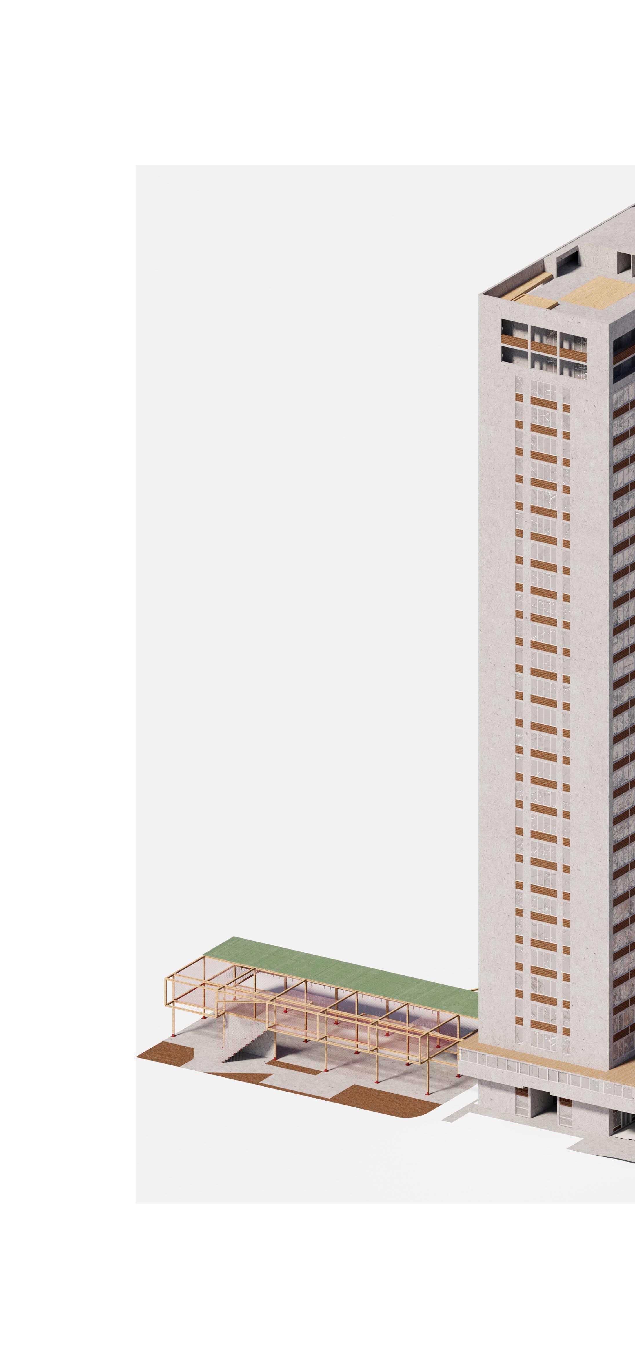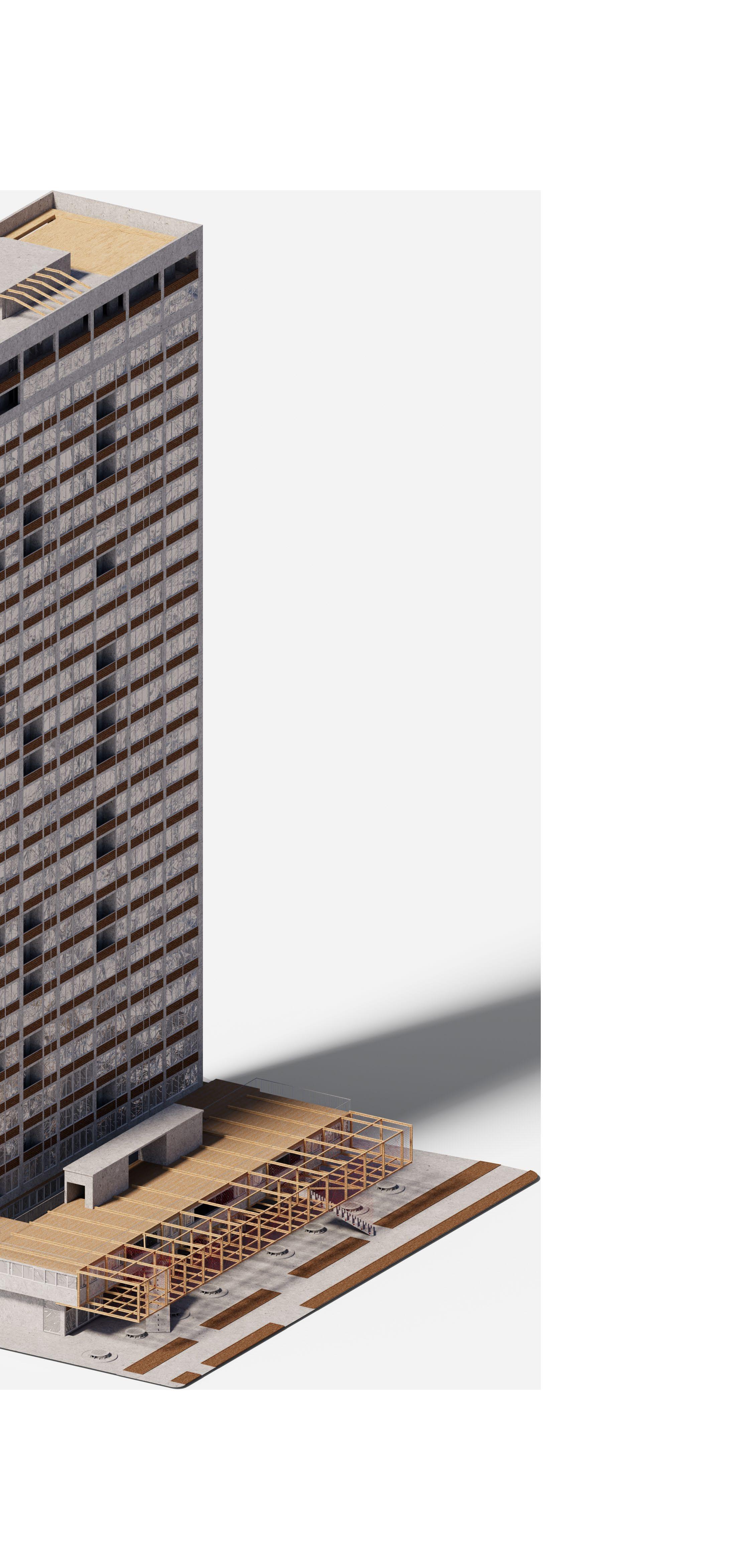 The so called “Invisible Skyscraper” will return to its original glory of the ‘60s. A series of interventions [02_1], focusing mainly on the ground floor, will bring back life to the skyscraper. So much unused space could potentially be something profitable for the tower not only money wise speaking. New shops, new identities, new spaces for the inhabitants are the key elements of this architectural reuse.