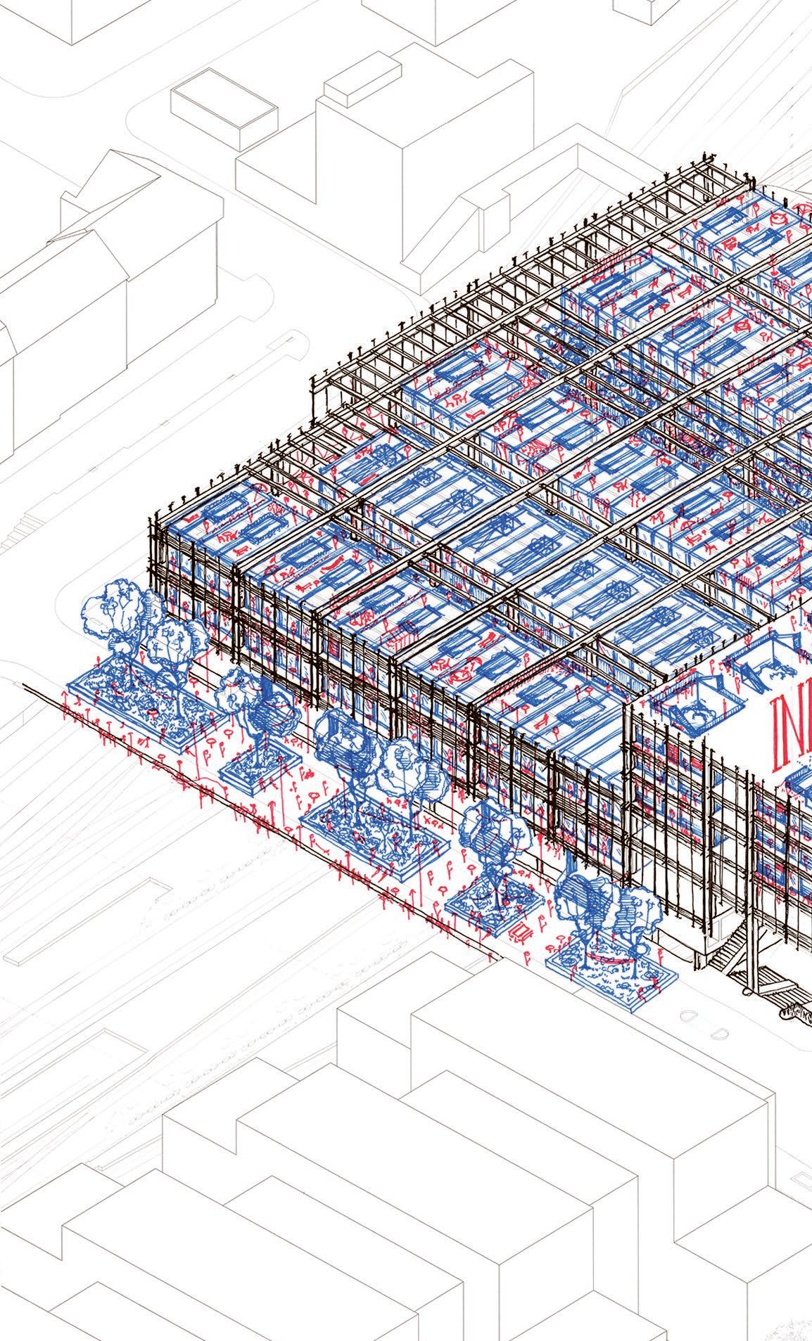 The main focus of the inteventions consists on a housing project to be placed on the last floors, craving for space and light to be reachable by every apartment units. A sort of game has been played to study the bearing grid in order to understand the possibilities of intervention. A square geometric composition originated from the existing disposition, which then generated modular typologies that combined toghether gave birth to a complex system of tetris-like apartment. The aim is to insert new uses and new possibilities in a given skeleton, granting new life to the building and to the new inhabitants.