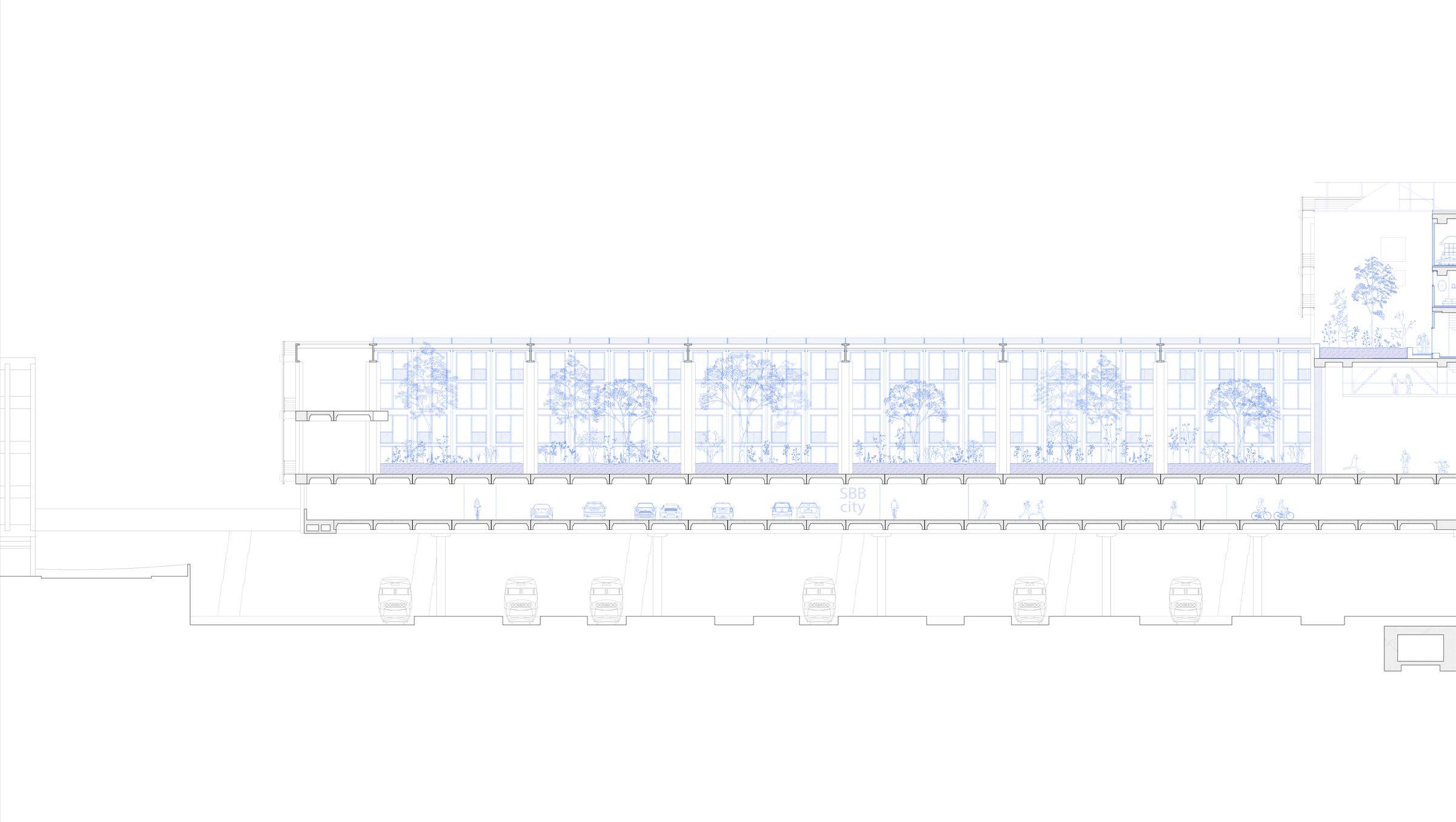 The post office building, the so-called “Rostbalken” due to its vivid red metal cladding, will soon change face due to a nearly ended competition (Nauentor) that will transform the old swiss post machine into a small office city. The challenge, and provocation, is to propose a more gentle re.use of the structure converging all the requirements inside the given volume of the building. With an overall usable area of 120.000 square meters the games are just started.