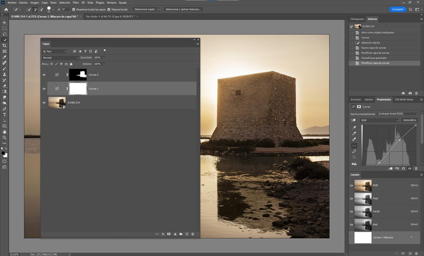 Hay muchas formas por ejemplo las máscaras de luminosidad. Lo más sencillo es acudir a la herramienta Lazo (L) y rodear la zona que queremos equivocándose por dentro. Luego creamos una capa de ajuste de curvas con máscara de capa y ajutamos.