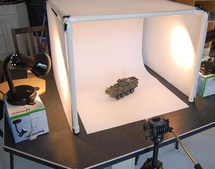 Otra idea de cómo hacer una caja de luz, en este caso con una estructura a base de tubos de desagüe. Observa en este caso la cartulina blanca curvada a modo de fondo del objeto para generar en la foto un fondo uniforme.