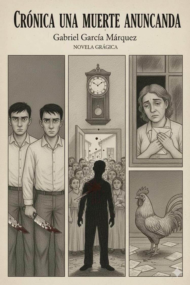 Cómic inspirado en la novela Crónica de una muerte anunciada, leído a la luz de la carta 3 “El poder de la persuasión”, 6 “El tiempo”, 9 “La caja china” y 10 “El dato escondido” del libro Cartas a un joven novelista de Mario Vargas Llosa. Es una narración visual de la obra hablando sobre el destino, la estructura y la perspectiva (temas que Vargas Llosa analiza como claves del oficio narrativo) en escenas gráficas donde el enigma, la circularidad del relato y la construcción del punto de vista cobran forma a través de imágenes secuenciales.