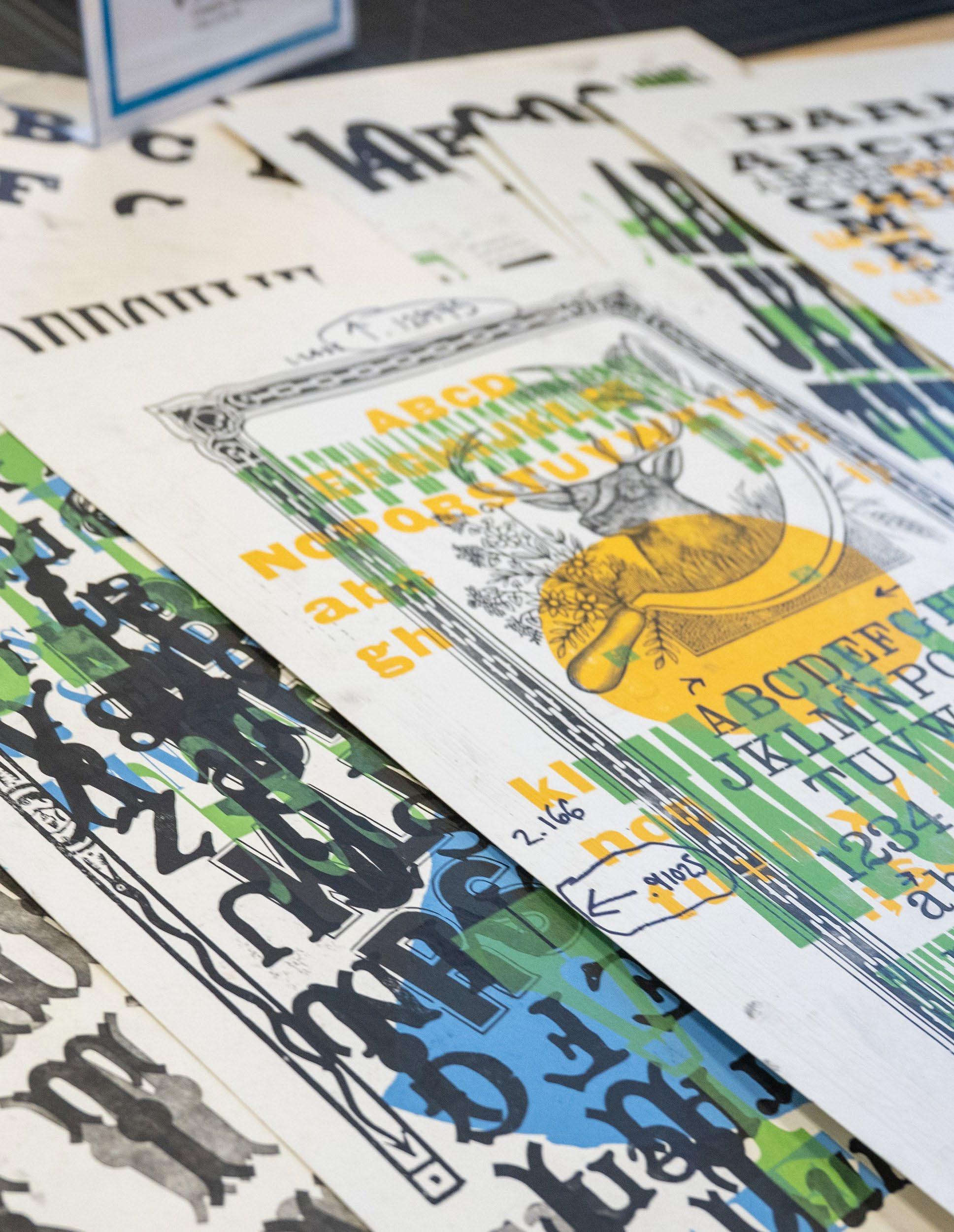 Carley’s academic research combines analog print and digital technologies in graphic design courses to improve student learning outcomes. This research informs the structure of her curricula and assignments. Her course projects emphasize the creative process and how that process informs project deliverables. Students use hands-on creating practices: they begin working on paper, then move to digital spaces and softwares, and then bring those projects back into the physical world using historical and modern production tools. Coursework in her classes integrate the Rob Roy Kelly American Wood Type Collection to enrich student comprehension of typography, grid structures, page layout, historical image-making techniques, and graphic design principles.