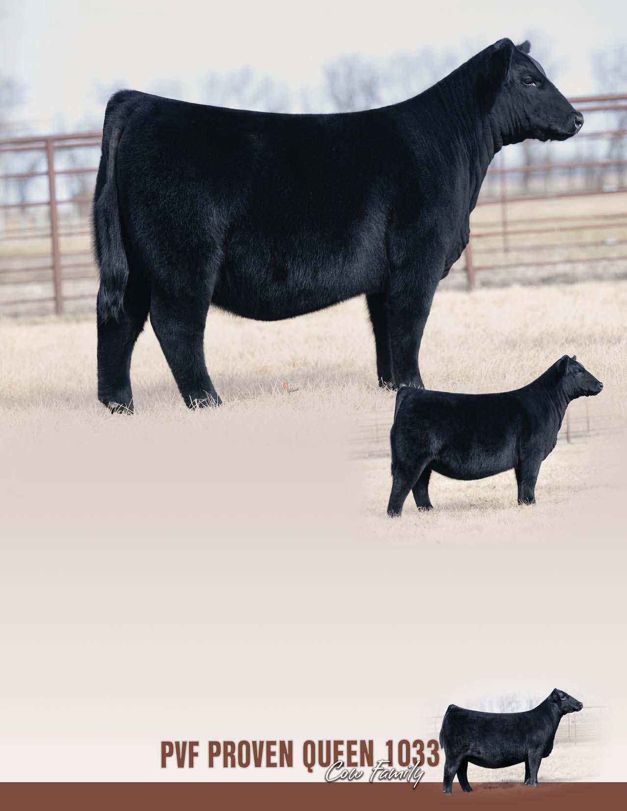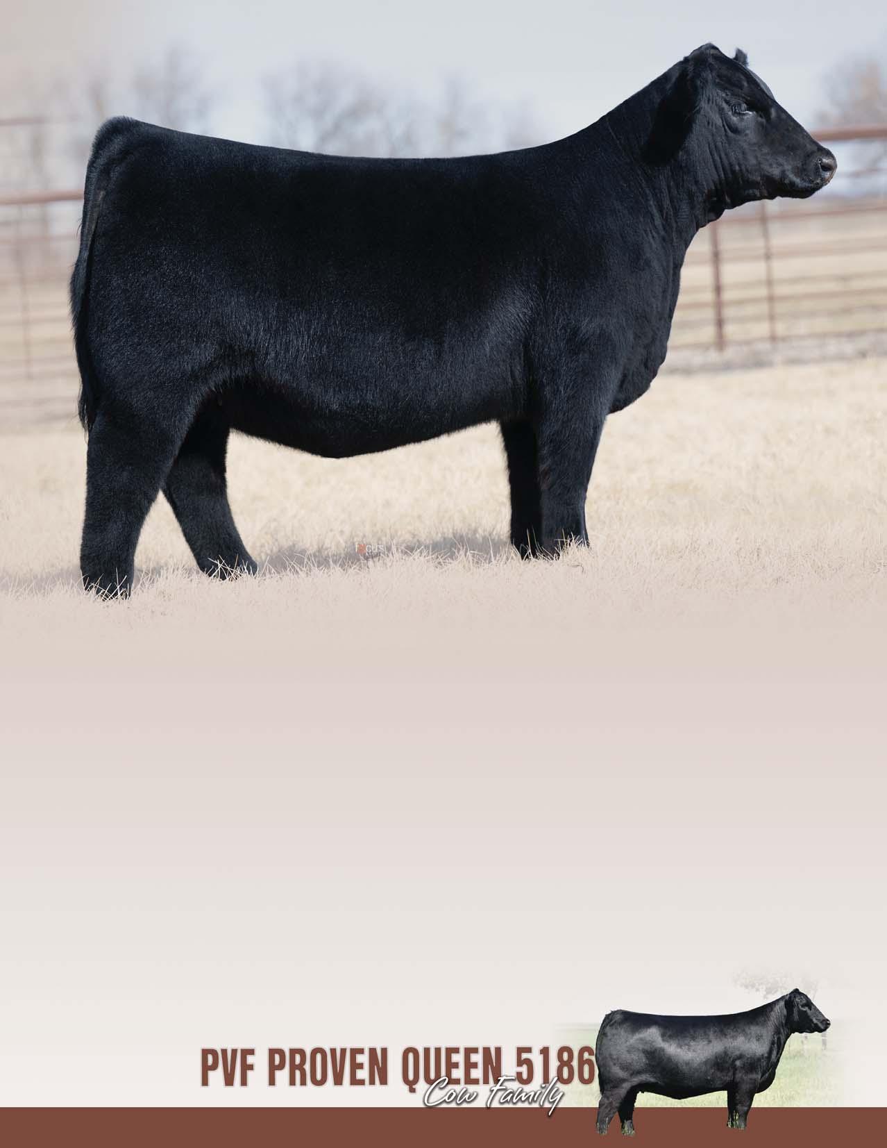 Highlighting a full sister to the 2024 National Junior Angus Show Fourth Overall Female, this May heifer matches PVF Proven Queen 3025, who topped our Fall 2023 PVF Production Sale and went on to be a many time champion. This heifer is also a full sister to PVF Proven Queen 1033, the past National Western Stock Show division champion, whose offspring are featured in this catalog as Lots 1-2. Another full sister, PVF Proven Queen 5043, was a popular $35,000 feature of our fall sale, and went on to be a class winner at the 2026 Cattlemen’s Congress for Caden Crain. Retaining half embryo interest.