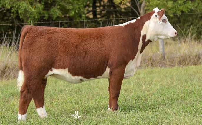 34 39LOT 40LOT KCF BENNETT ENCORE Z311 ETNJW 79Z Z311 ENDURE 173D ET BW 91H 100W RITA 79Z ETLOEWEN GENESIS G16 ET MSU TCF REVOLUTION 4RLOEWEN 77 48 MISS 344N 4RB42ET PCR JACKLYN NIKOLE 344N HYALITE ON TARGET 936 {MSUDC}R LEADER 6964 R MISS REVOLUTION 1009KJ 271C TERRI LEAD 835E KJ TMG 236X TEBOW 646ZKJ 865A TERRI 271C KJ 208X TORI 865A DOB: 02/16/2021 REG: 44235835 POLLED39 KJ 835E GENETTE 300J ET Outstanding spread from Calving ease – birth – weaning weight! Her dam 835E is a perfect uddered R LEADER 6964 daughter! Bred AI to SCC 167Y Trust 1701 P43777035 on 5/9/22. Preg. checked safe to AI date. PE to KJ 482Y Leader 873E ET P43833918 5/15/22 - 7/6/22 CE BW WW YW DMI SC SCF MM M&G MCE 11.4 1.3 70 115 0.8 1.7 15.9 27 62 7.6 121 1.2 1.2 87 0.038 0.64 0.23 $365 $459 $143 MCW UDDR TEAT CW FAT REA MARB BMI BII CHB KCF BENNETT ENCORE Z311 ETNJW 79Z Z311 ENDURE 173D ET BW 91H 100W RITA 79Z ETLOEWEN GENESIS G16 ET MSU TCF REVOLUTION 4RLOEWEN 77 48 MISS 344N 4RB42ET PCR JACKLYN NIKOLE 344N EFBEEF TFL U208 TESTED X651 ETEFBEEF BR VALIDATED B413 EFBEEF 4R THYRA Y865BR VALIDATED B413 5064 7603 CHURCHILL RED BULL 200ZBR RED BULL 200Z 2111 5064 BR BENNETT OF 5240 2111 DOB: 02/17/2021 REG: 44270874 HOMO POLLED40 KJ 7603 GENETTE 307J ET 307J is a full sister to the high selling Hereford bull in the Denver Sale 2022! Selling to Larson Herford Farm, WI and Phil Barnett, New Zealand. She is moderate in her frame, look at her BREED LEADING figures! Top 1% Marbling, Top 2% CHB, Top 10% CE, Top 5% REA. Excellent pigment and markings! Homozygous Polled! Bred AI to KJ BJ 309C Leader 182F P43930534 on 5/9/22. Preg. checked safe to AI date. PE to KJ C15 Trust 452J 44279157 from 5/15/22 - 7/6/22 CE BW WW YW DMI SC SCF MM M&G MCE 8.4 0.9 62 96 0.8 1.6 18.3 32 63 7.8 66 1.2 1.2 78 0.128 0.76 0.72 $408 $528 $165 MCW UDDR TEAT CW FAT REA MARB BMI BII CHB KJ 271C TERRI LEAD 835E
