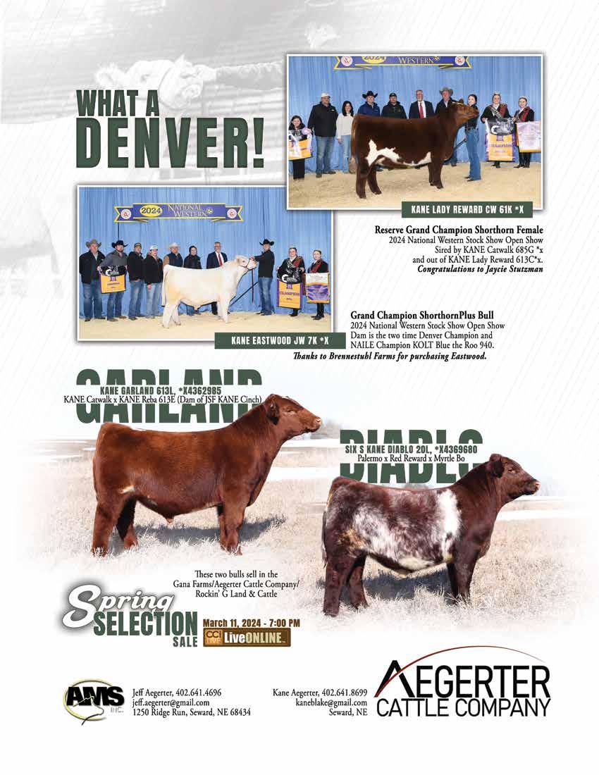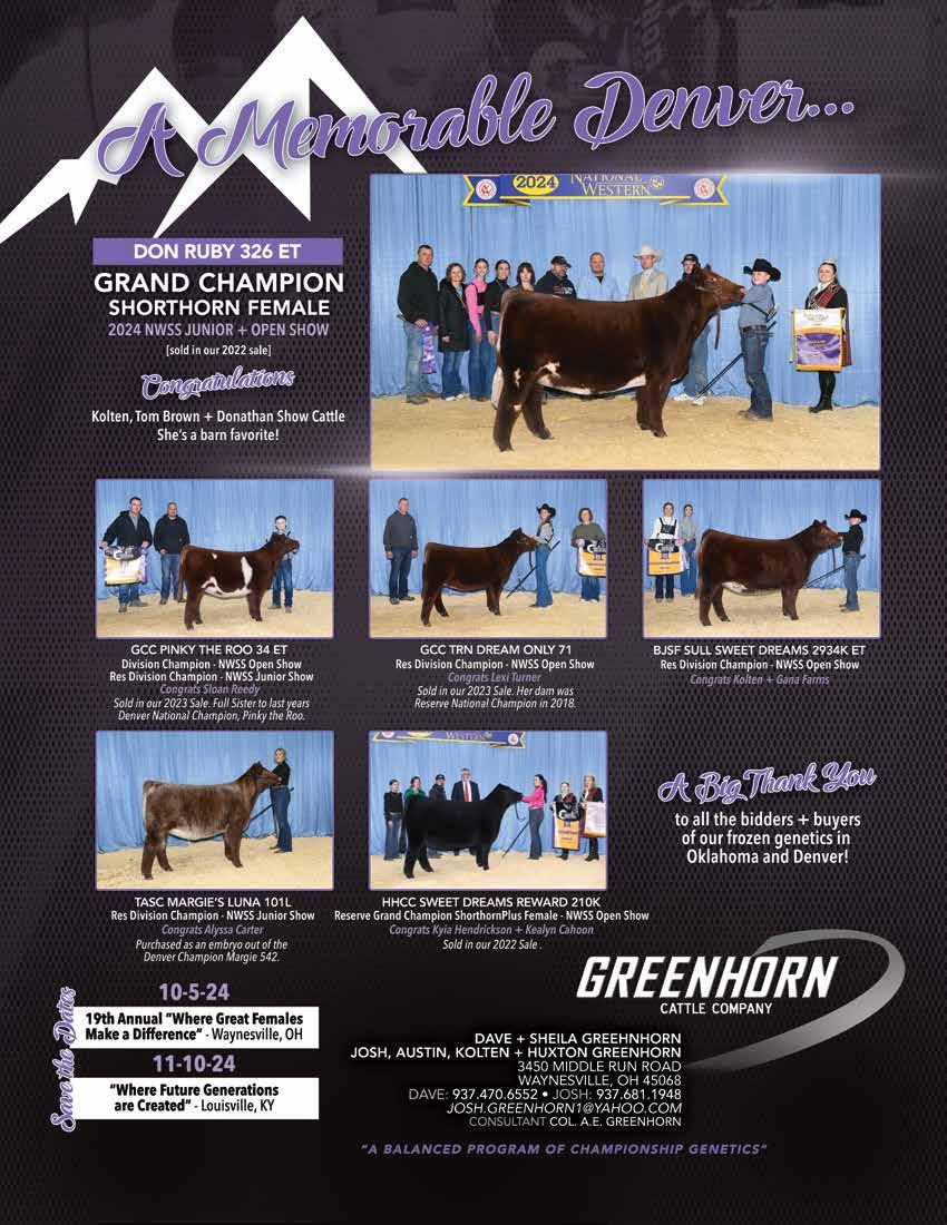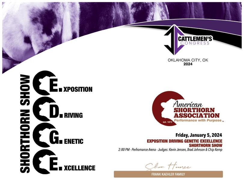 by the American Shorthorn Association, 7607 NW Prairie View Rd., Platte Woods, MO 64151. Subscription rates are $24.00 for 1 year, $38.00 for 2 years, and $52.00 for 3 years in the U.S.; $60.00 for 1 year, $110.00 for 2 years, and $130.00 for 3 years to Canada and $120.00 for 1 year, $220.00 for 2 years, and $300.00 for 3 years to other foreign countries. Periodicals postage paid at Kansas City, MO and additional mailing offices. POSTMASTER: send address changes to SHORTHORN COUNTRY, 7607 NW Prairie View Rd., Platte Woods, MO 64151. The March cover photos were taken by Next Level Images at OKC and Legacy Livestock Imaging at Denver. Features NCBA “Onward to Orlando” ..................................................... 28 Summer Symposium Details + Schedule ..................................... 30 Cattlemen’s Congress 2024 Show Honoree - Kaehler Family 40 Junior National Updates 85 march 2024 The Voice of the Shorthorn Breed. Departments Update .......................................................................... 8 Association Outlook ................................................... 12 Beef Business 16 Since You Asked .......................................................... 20 In the Know 24 Tartan Plaid ................................................................ 34 Junior Corner 36 News & Notes ............................................................ 86 Sales Calendar 95 Ad Index ..................................................................... 97 Sale Reports “The Summit at OKC” National Shorthorn Sale......................... 82 “The Summit at Denver” National Shorthorn Sale ...................... 83 Durhams in the Dakotas 2023 .................................................... 84 Show Results Cattlemen’s Congress Pen Show 42 Cattlemen’s Congress E.D.G.E Show 47 Cattlemen’s Congress Junior Shows ............................................. 50 Cattlemen’s Congress Super National Shorthorn Show ............... 56 Cattlemen’s Congress Super National ShorthornPlus Show ......... 61 National Western Stock Show National Shorthorn Show 66 National Western Stock Show National ShorthornPlus Show ..... 70 National Western Stock Show Pen Show ..................................... 74 National Western Stock Show Junior Shows ............................... 78 advertising rates 1x 11x Full page $680 $610 2/3 page 505 465 1/2 page-island 405 375 1/2 page 380 350 1/3 page 290 275 1/4 page 235 210 1/6 page 165 150 Business card (1 1/2”) 50 400/yr * Additional cost for pictures & multiple proofs color rates 4 color $200 1 color $195 * Color only available on half of page or larger Contract Rates And Discounts: Contract rates require advertising in all 11 issues per year with a business card ad. Business card price is pre-paid at the beginning of the calendar year or pro-rated if started after the first issue of the year. Contract (11x) rates do not apply for any sale advertising. Contract advertisers must run the business card ad in every issue. Contracts will run by calendar year. No agency commissions are allowed. Online Sale Packages & Sale Catalogs Contact us about your upcoming Online Sale or Sale Catalogs for marketing options and pricing. 4 shorthorn country • march 2024
