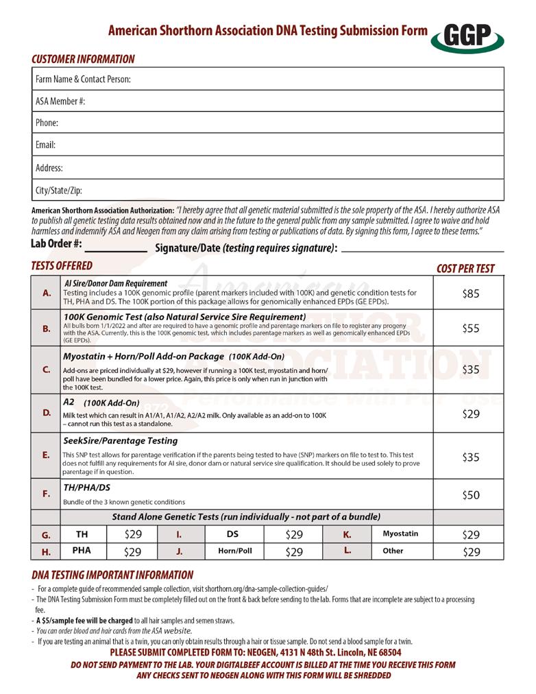 As a reminder, breeders can now send DNA samples directly to Neogen for testing rather than sending to the ASA office first. Starting July 1, 2023, a manual processing fee will be incurred for those samples sent to the office for preprocessing.