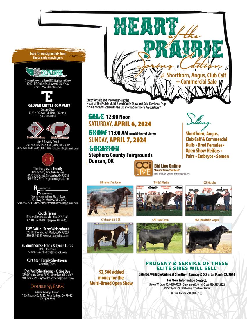 April 6 - Crow Creek Farms & Glover Cattle Company “Heart of the Prairie Shorthorn Sale Spring Edition”, Duncan, Okla.