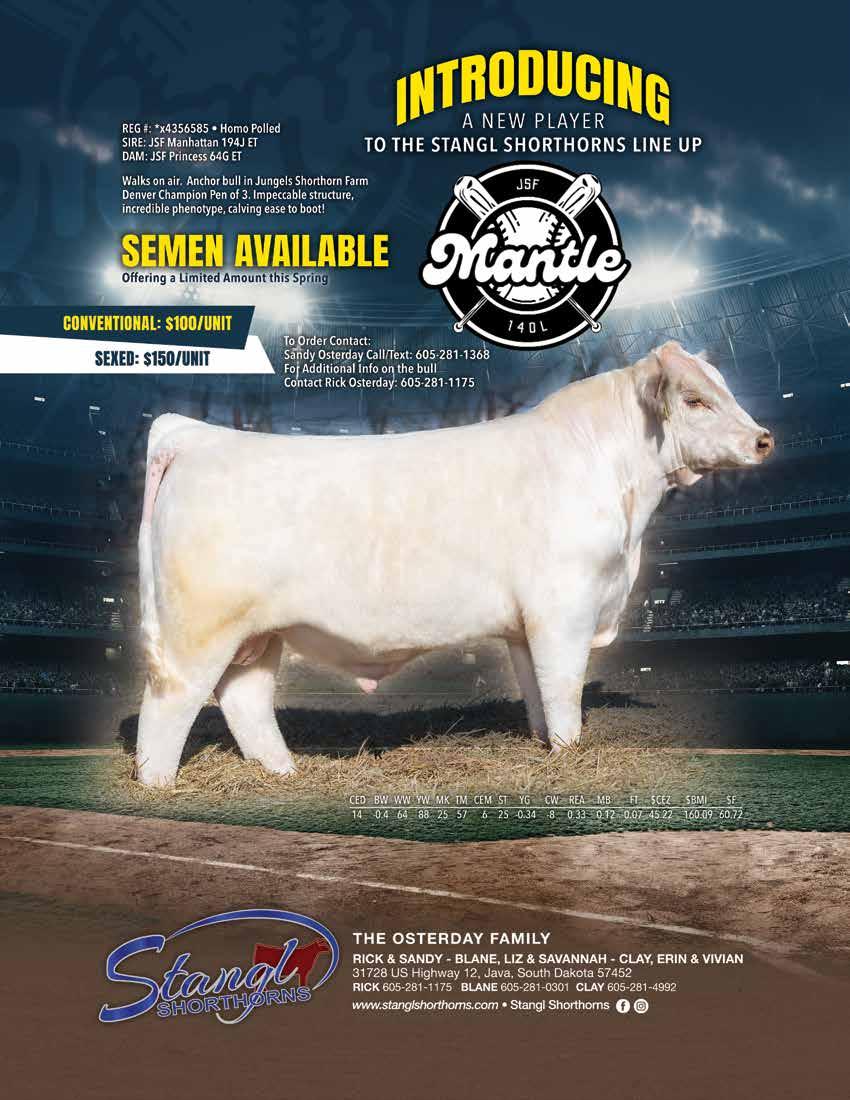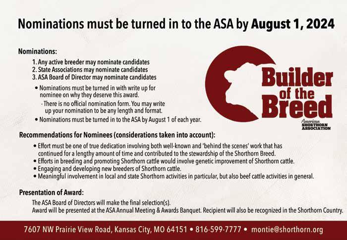 (ISSN 0149-9319) Published monthly by the American Shorthorn Association, 7607 NW Prairie View Rd., Platte Woods, MO 64151. Subscription rates are $24.00 for 1 year, $38.00 for 2 years, and $52.00 for 3 years in the U.S.; $60.00 for 1