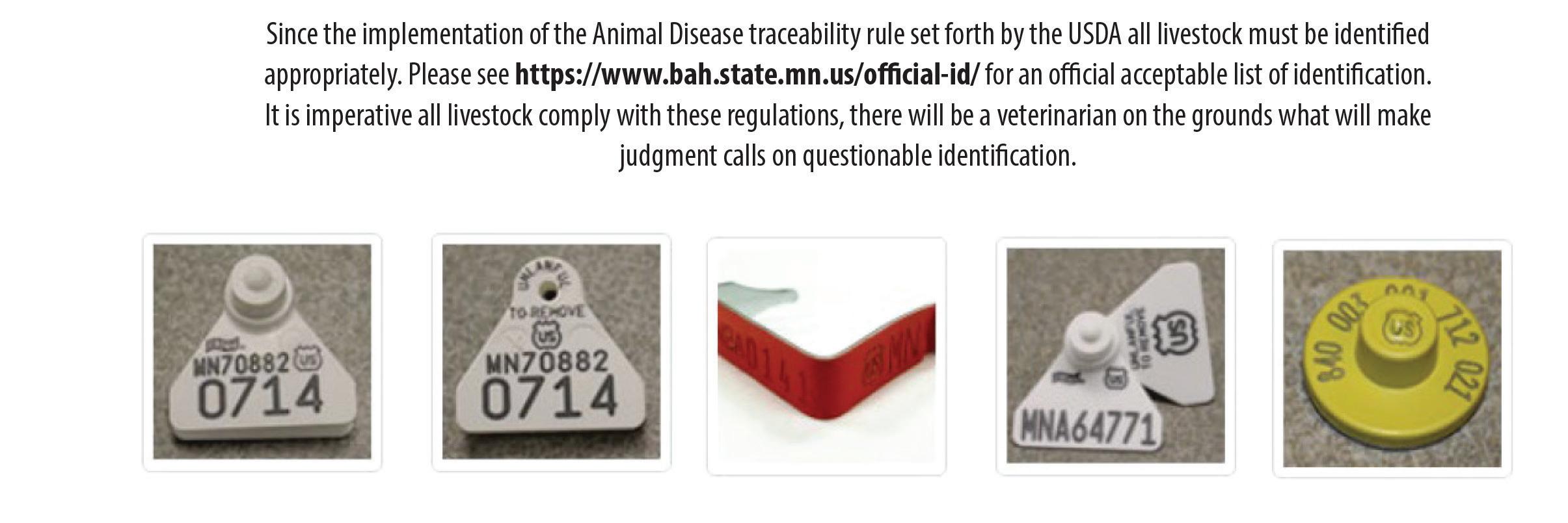 Since the implementation of the Animal Disease Traceability rule set forth by the UDSA all livestock must be identified appropriately. Please see https://www.bah.state.mn.us/official-id/ for an official acceptable list of identification. It is imperative all livestock comply with these regulations, there will be a veterinarian on grounds that will make judgment calls on questionable identification.