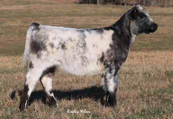 This heifer’s picture speaks for itself. With her eye-catching roan color, femininity and neck extension, she definitely has that show ring look. Backed by a pedigree of numerous greats, she will be fun to develop.