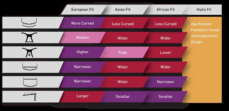 Per aiutarvi a trovare la montatura più adatta, abbiamo identificato l’appoggio come European Fit, Asian Fit, African Fit e Alpha Fit.